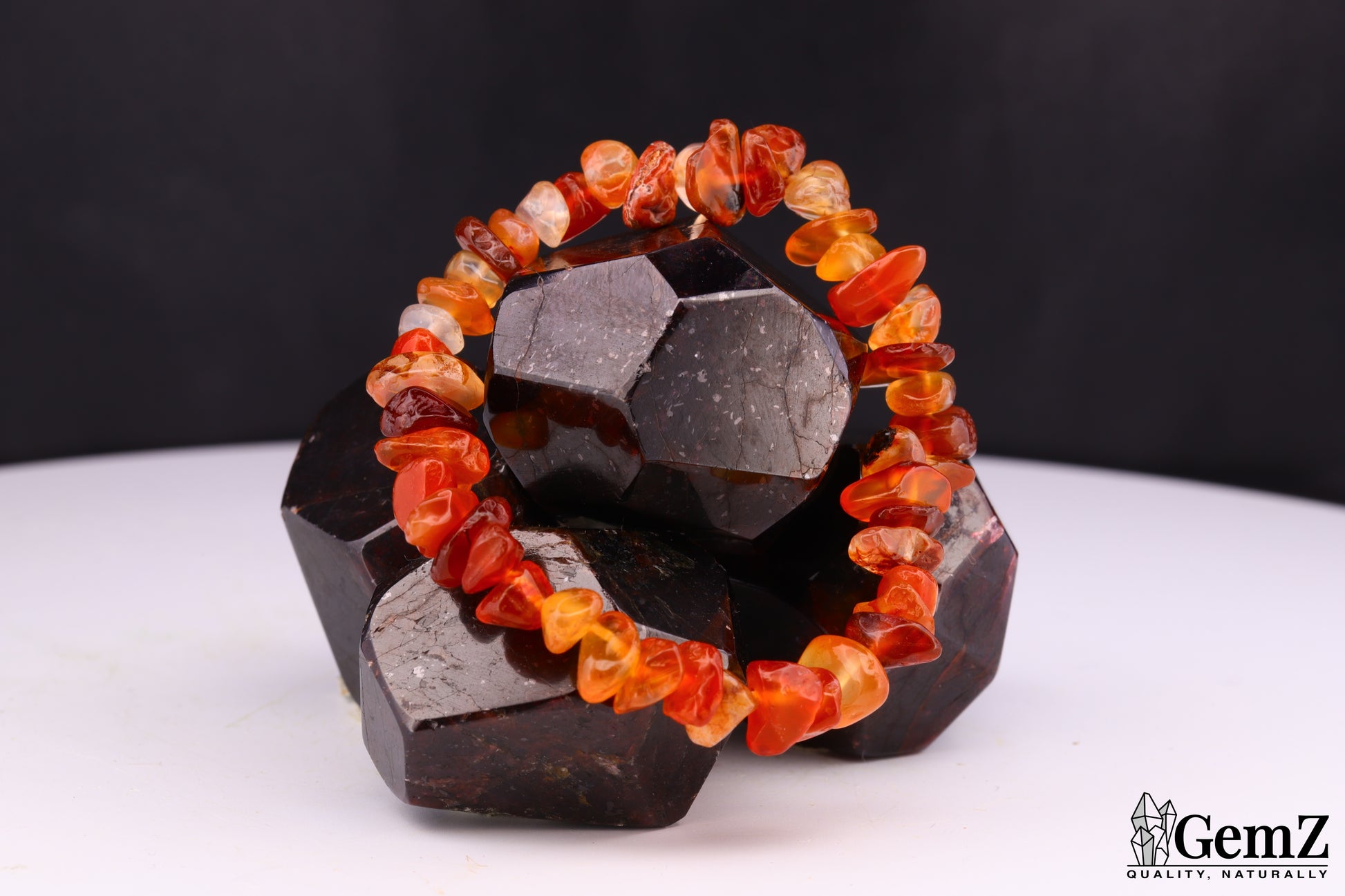 Bracelet baroque en cornaline naturelle, composé de chips polis aux formes irrégulières. Sa couleur orange à rouge-orangé, parfois nuancée de tons plus clairs ou plus foncés, offre un rendu chaud, vivant et naturel.