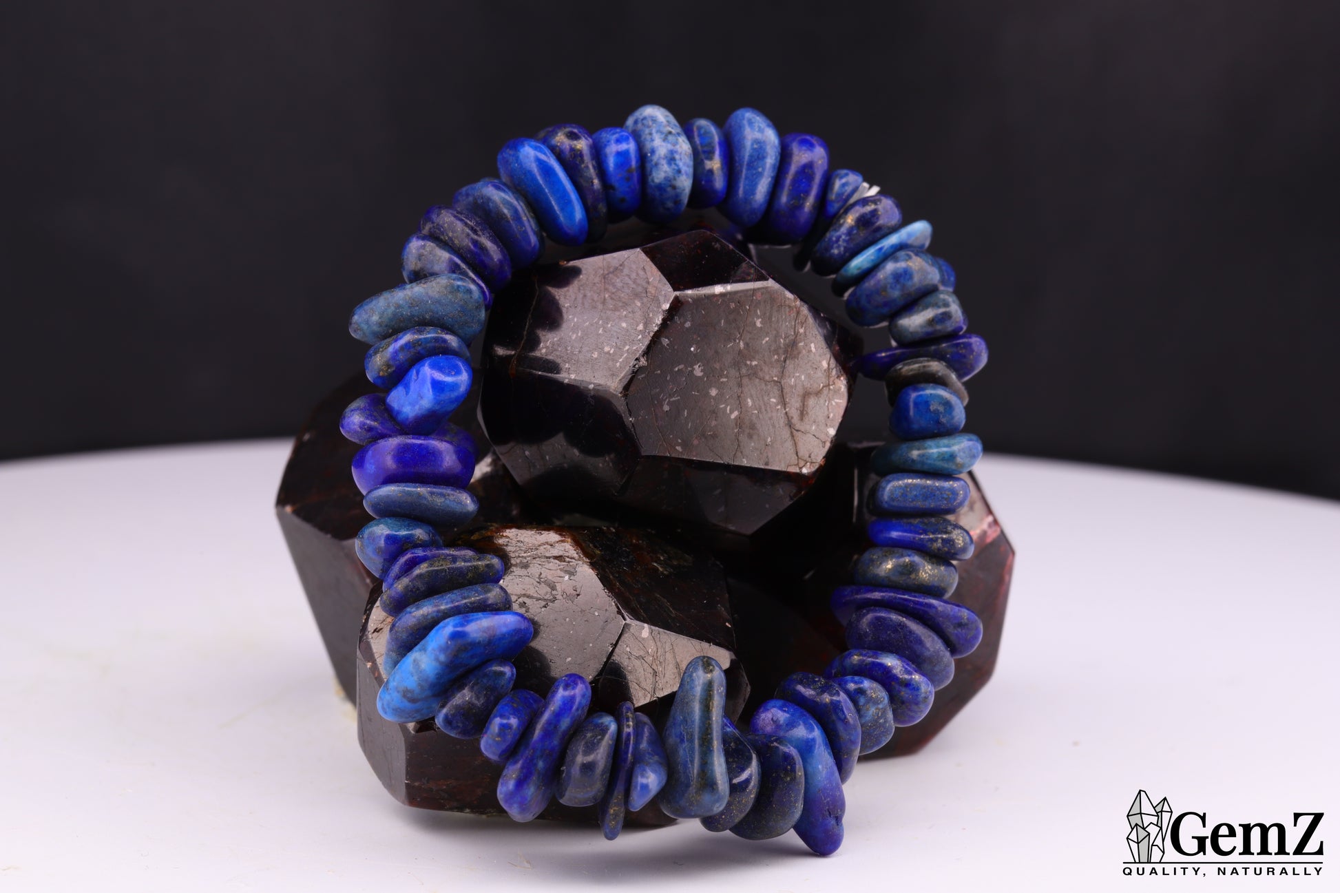 Bracelet baroque en lapis-lazuli naturel, composé de chips polis aux formes irrégulières. Montage sur fil élastique résistant, confortable pour un port quotidien.