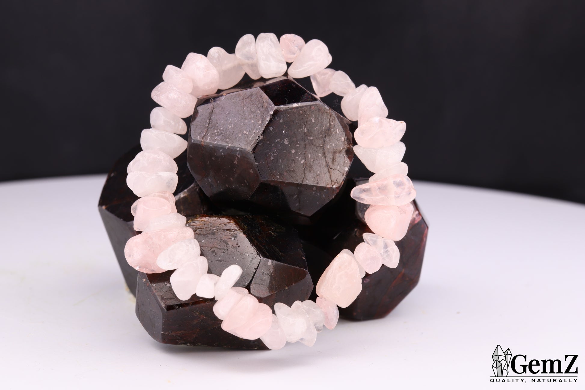 Bracelet baroque en quartz rose naturel, composé de chips polis aux formes irrégulières. Sa teinte rose pâle à rose laiteux, parfois légèrement translucide, offre un rendu doux et lumineux, parfait au quotidien, seul ou en accumulation.