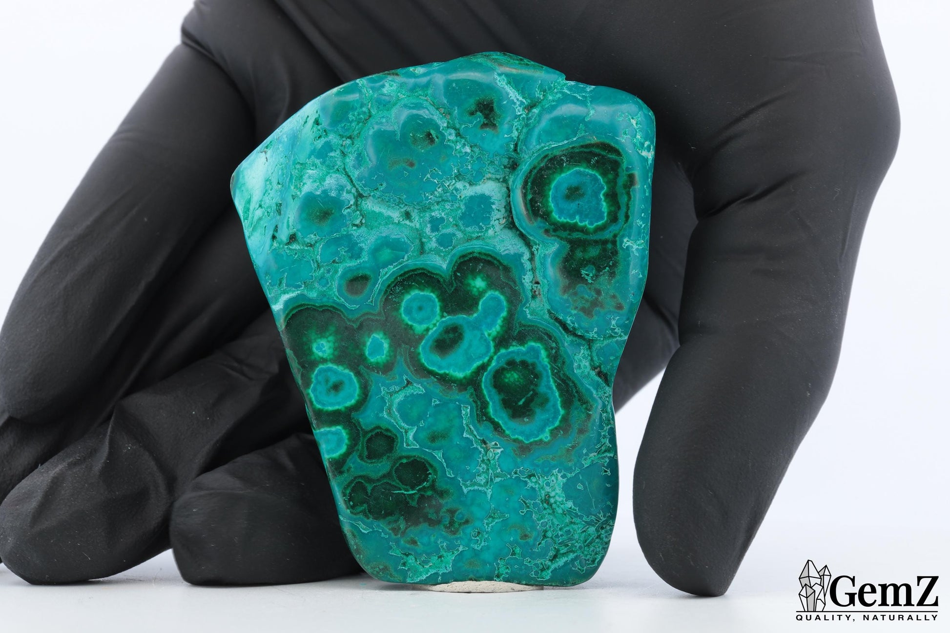 Cette splendide pièce de Chrysocolle-Malachite de 93g dévoile des motifs captivants en cercles et des nuances vibrantes de turquoise et vert émeraude. Sa surface polie sublime ses détails naturels et en fait une pièce d'exception.