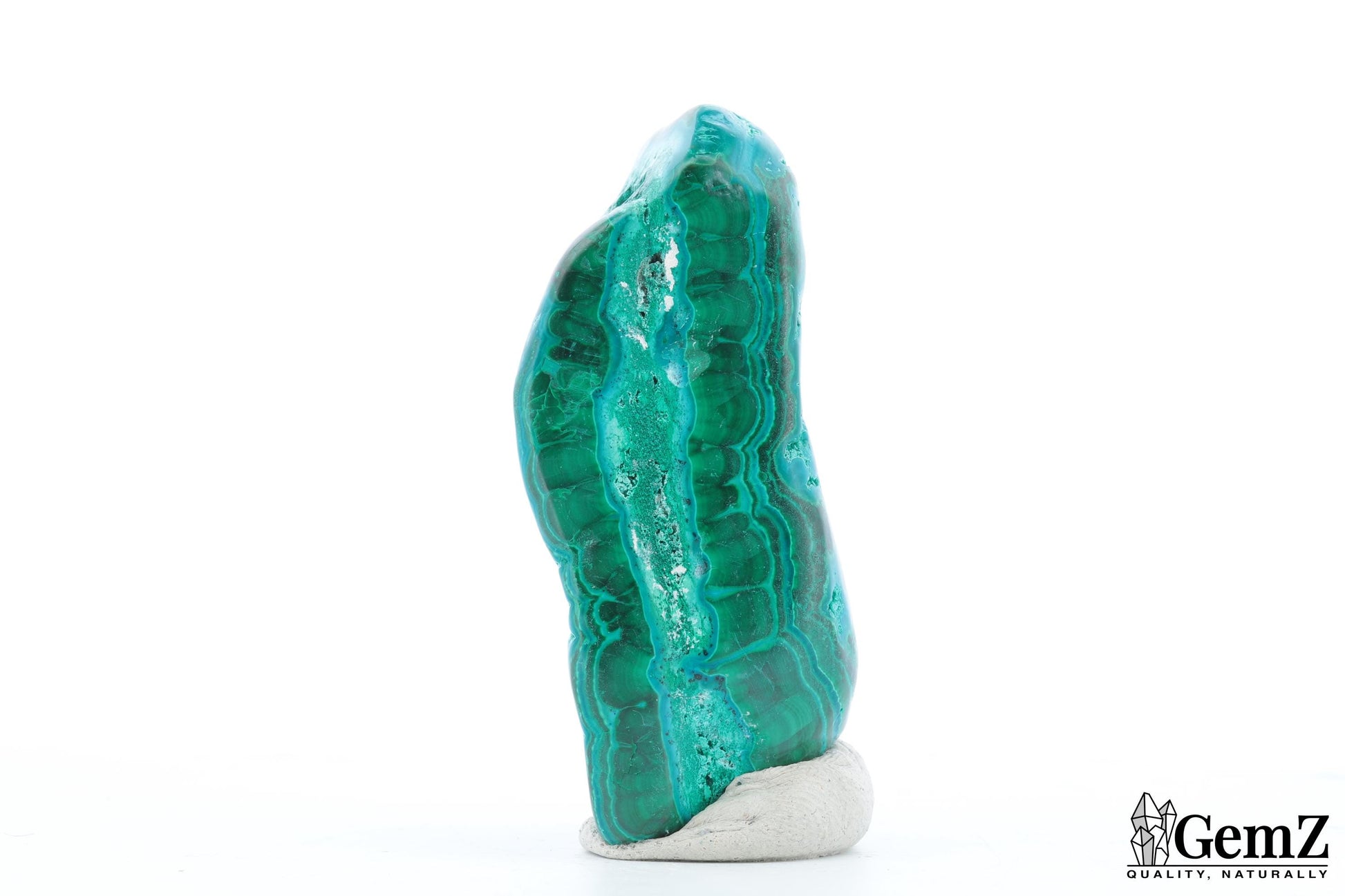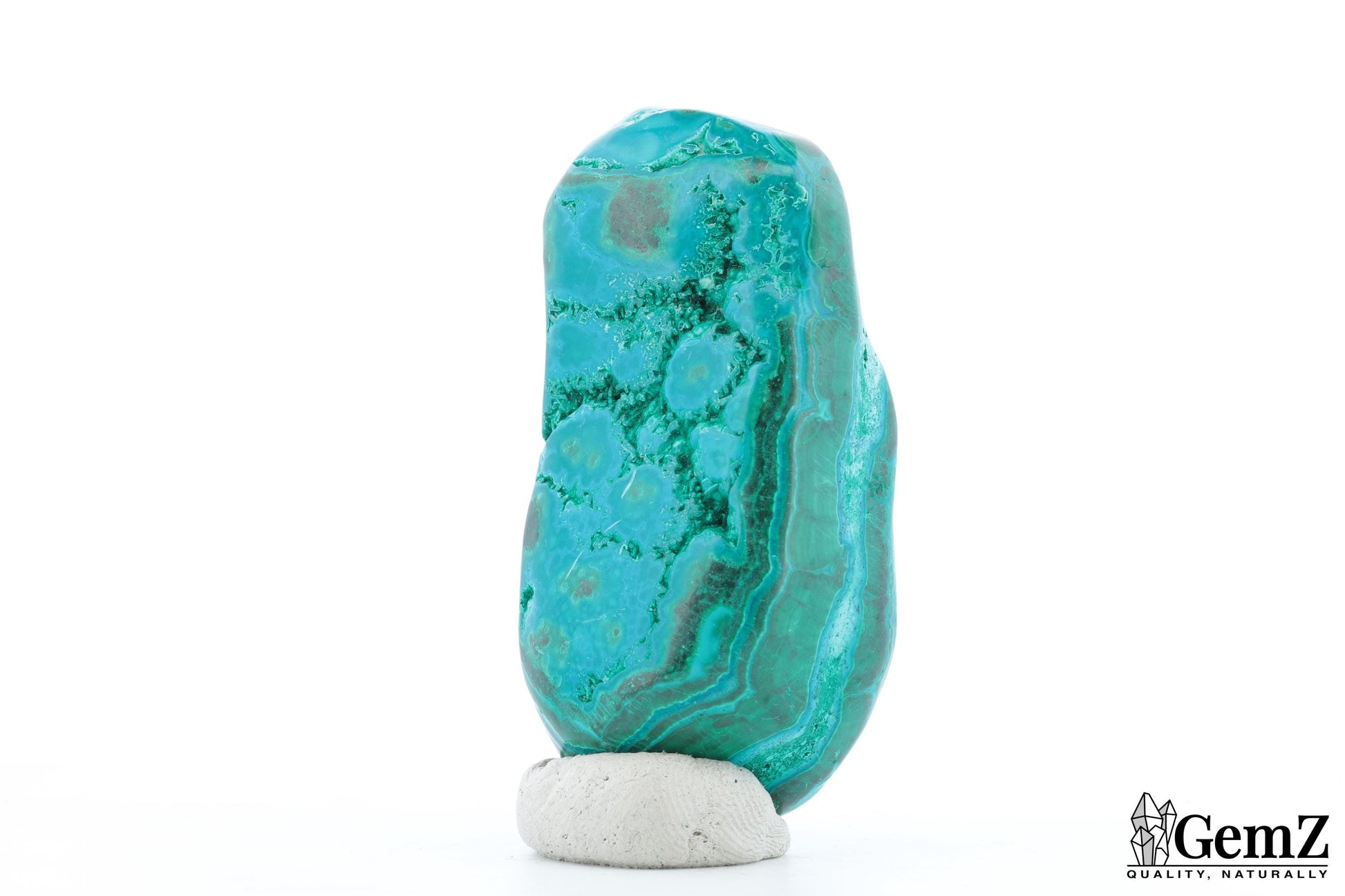 La Chrysocolle, souvent associée à la malachite, se forme dans des environnements riches en cuivre. Les inclusions distinctives et les couleurs vibrantes de cette pièce témoignent de millions d'années d'évolution géologique.