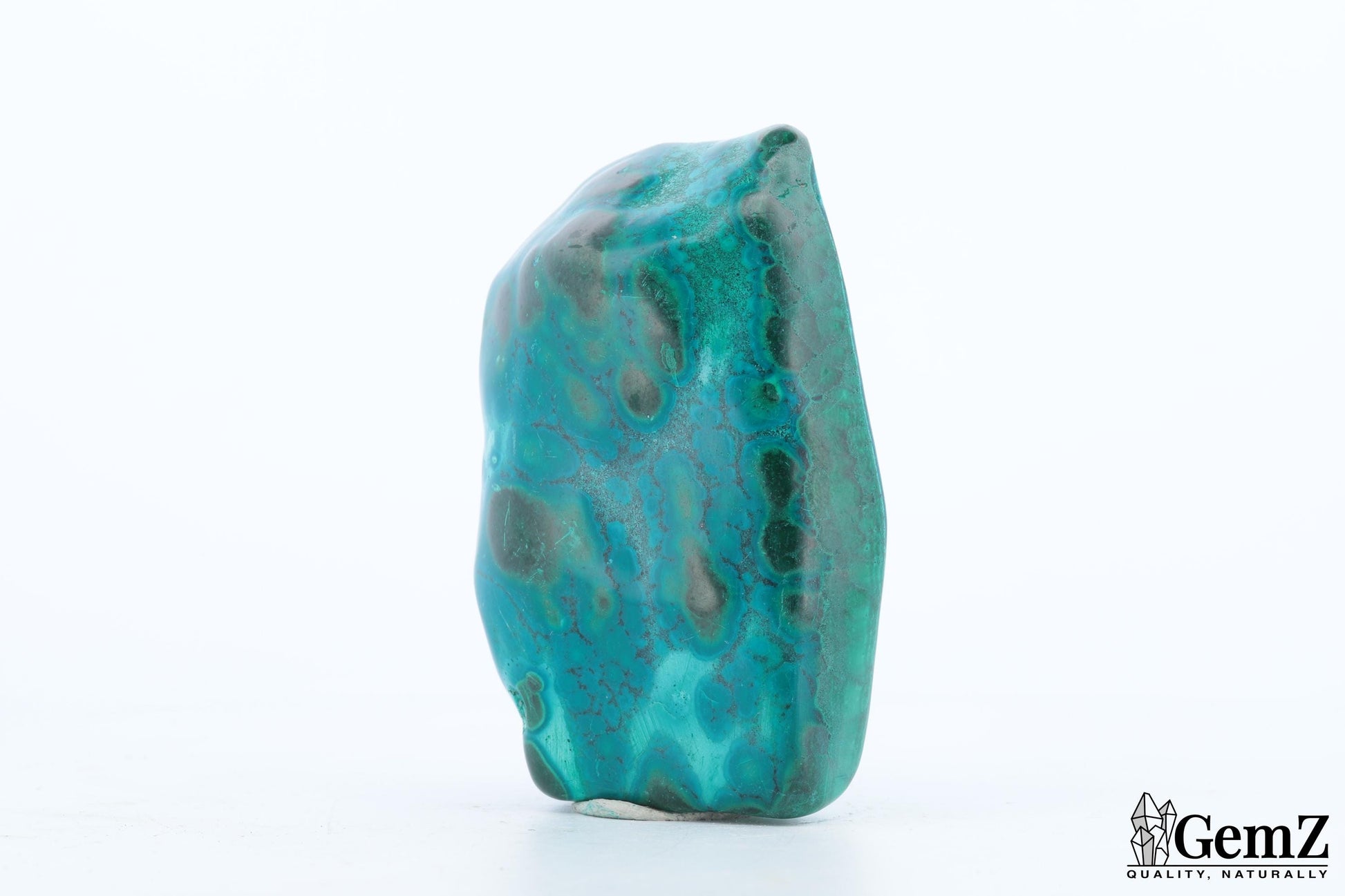 Cette pièce compacte de Chrysocolle-Malachite se distingue par ses teintes éclatantes de bleu turquoise et de vert profond. Les motifs naturels, semblables à des empreintes liquides, sont magnifiés par une surface polie, offrant un jeu de lumière fascinant.