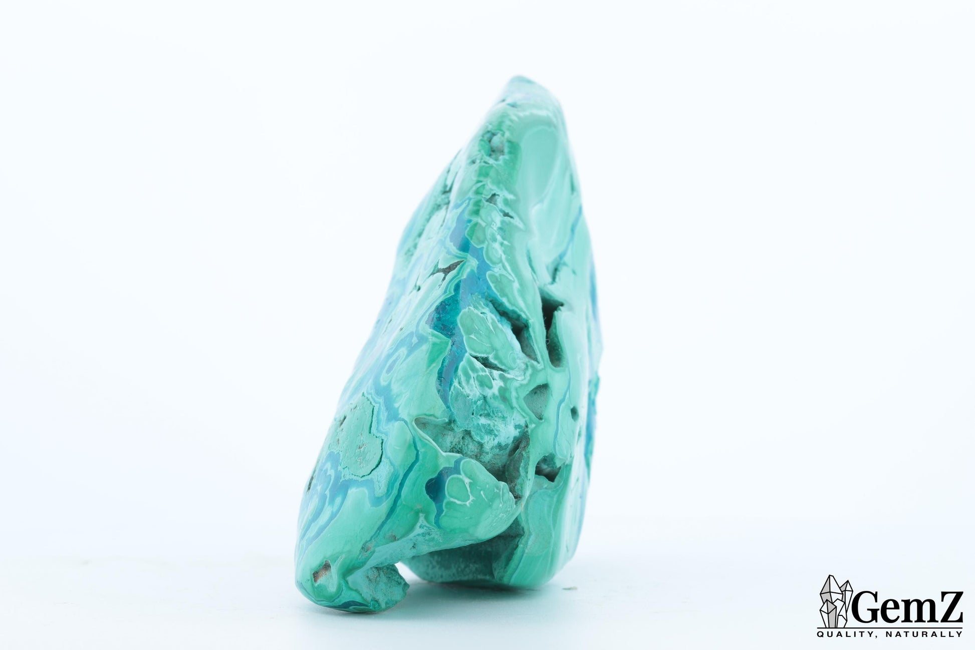 Formée sur des millions d’années dans les veines des gisements de cuivre, la Chrysocolle-Malachite est le fruit d’une alchimie naturelle entre ces deux minéraux. Cette combinaison rare crée des motifs organiques captivants et uniques.