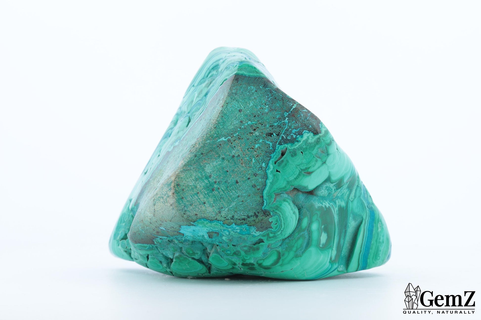 Cette superbe pièce triangulaire de Chrysocolle-Malachite est un véritable joyau naturel. Arborant des nuances éclatantes de vert émeraude et de turquoise, ses motifs ondulés rappellent des vagues figées dans la roche. Une finition polie sublime sa surface, tandis que son poids généreux de 218g en fait un spécimen exceptionnel pour tout collectionneur ou amateur de minéraux.