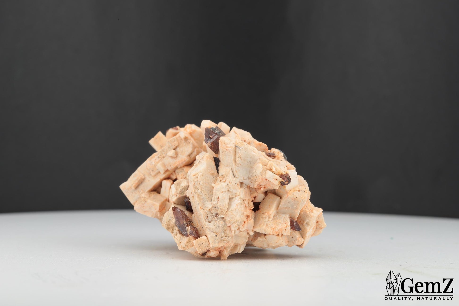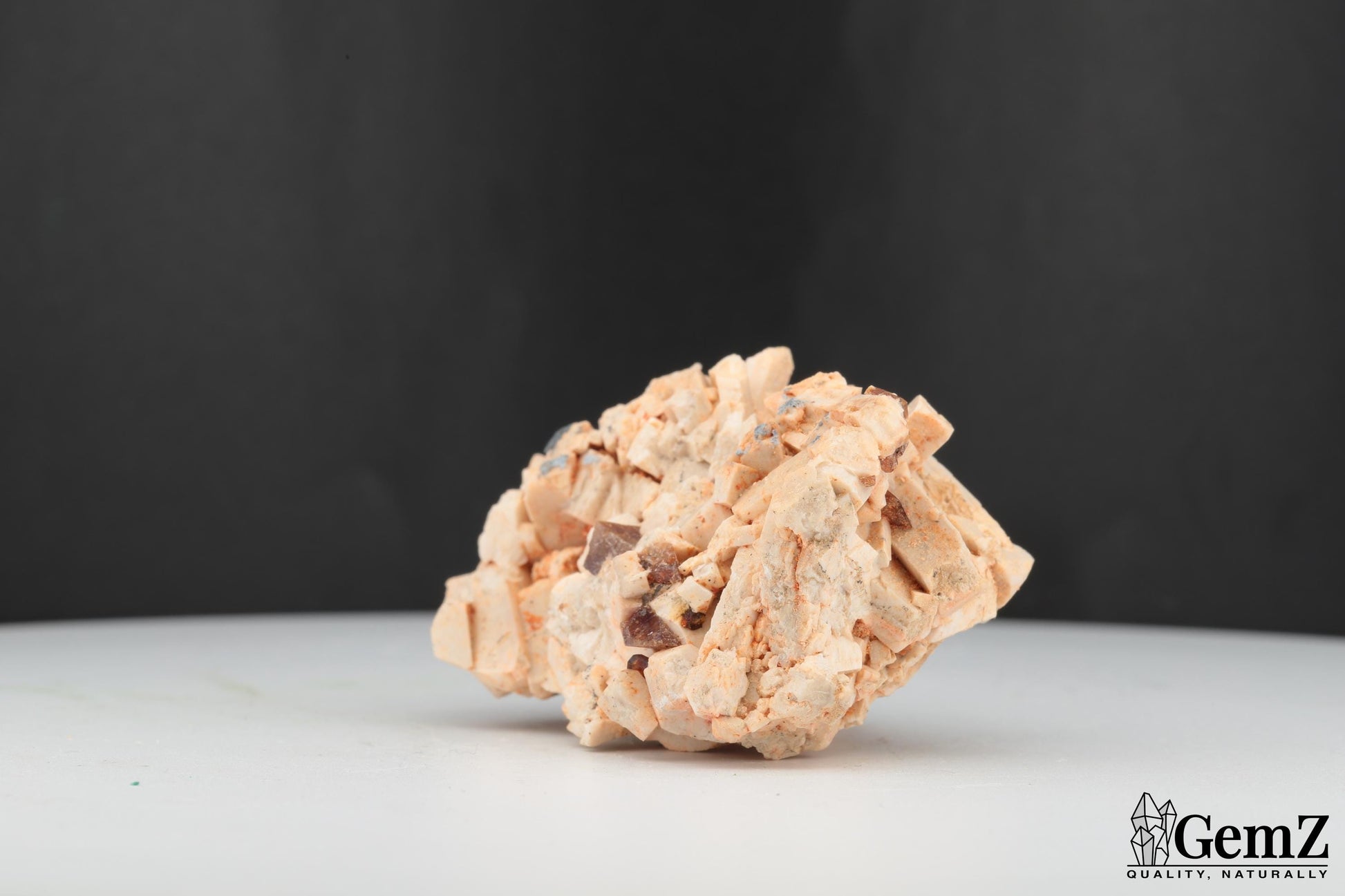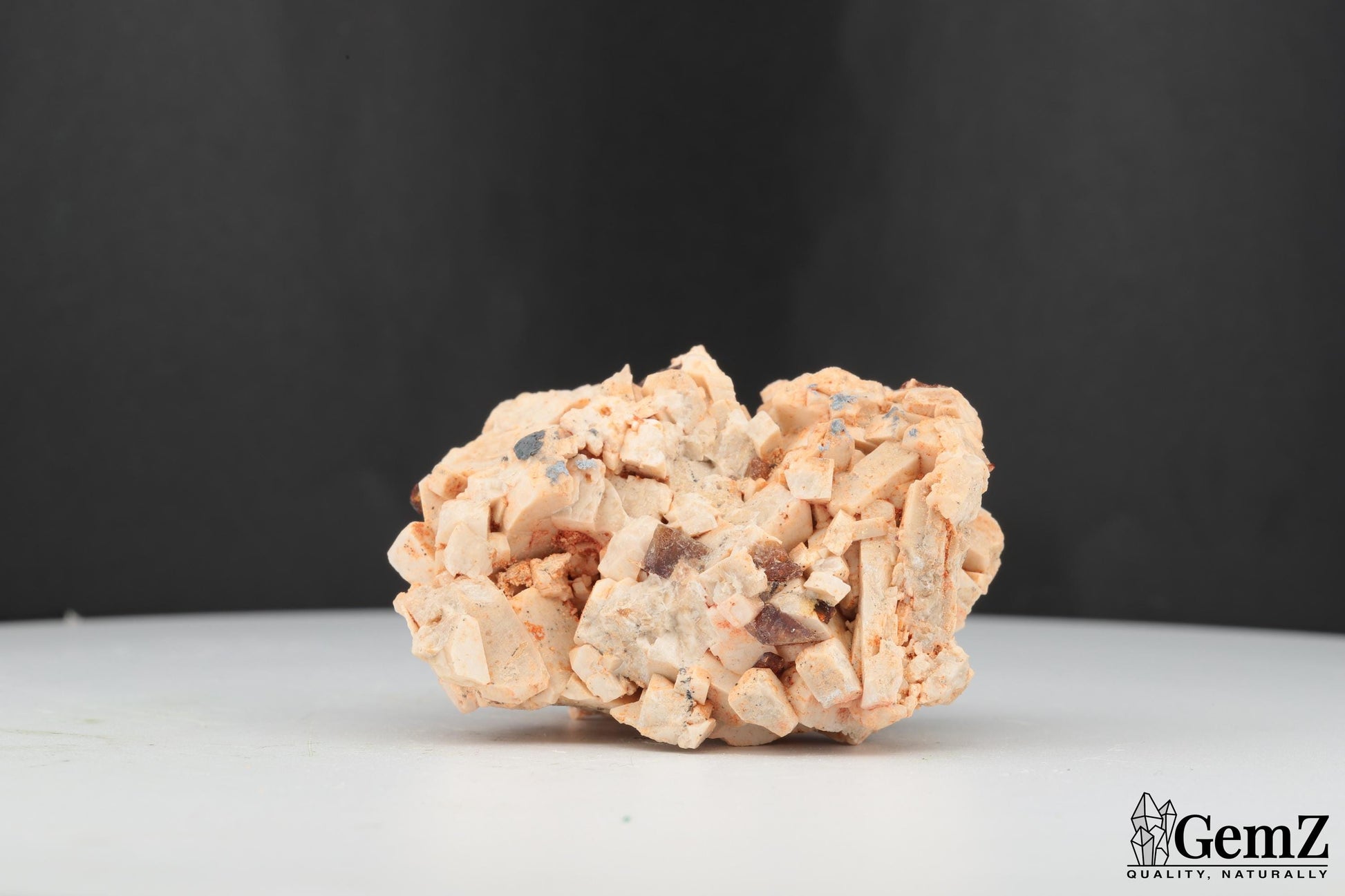 Composition : Ce spécimen exceptionnel met en valeur des cristaux brillants de titanite (sphène) d’un brun doré délicat, élégamment dispersés sur une matrice d’orthose beige clair. Les cristaux d’orthose, avec leur structure en blocs géométriques naturels, offrent un magnifique contraste textural et chromatique avec les éclats lumineux de la titanite.