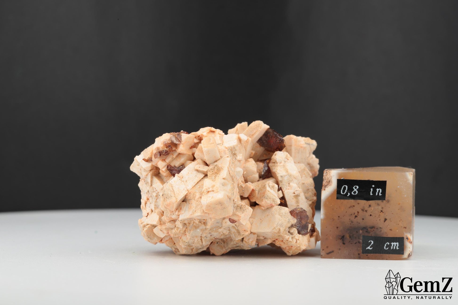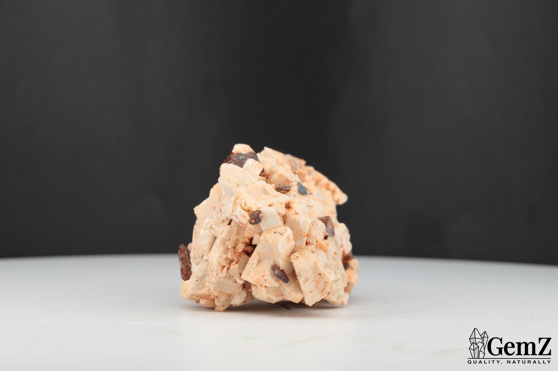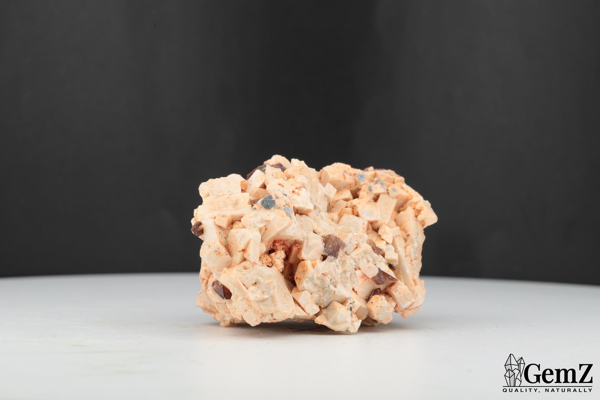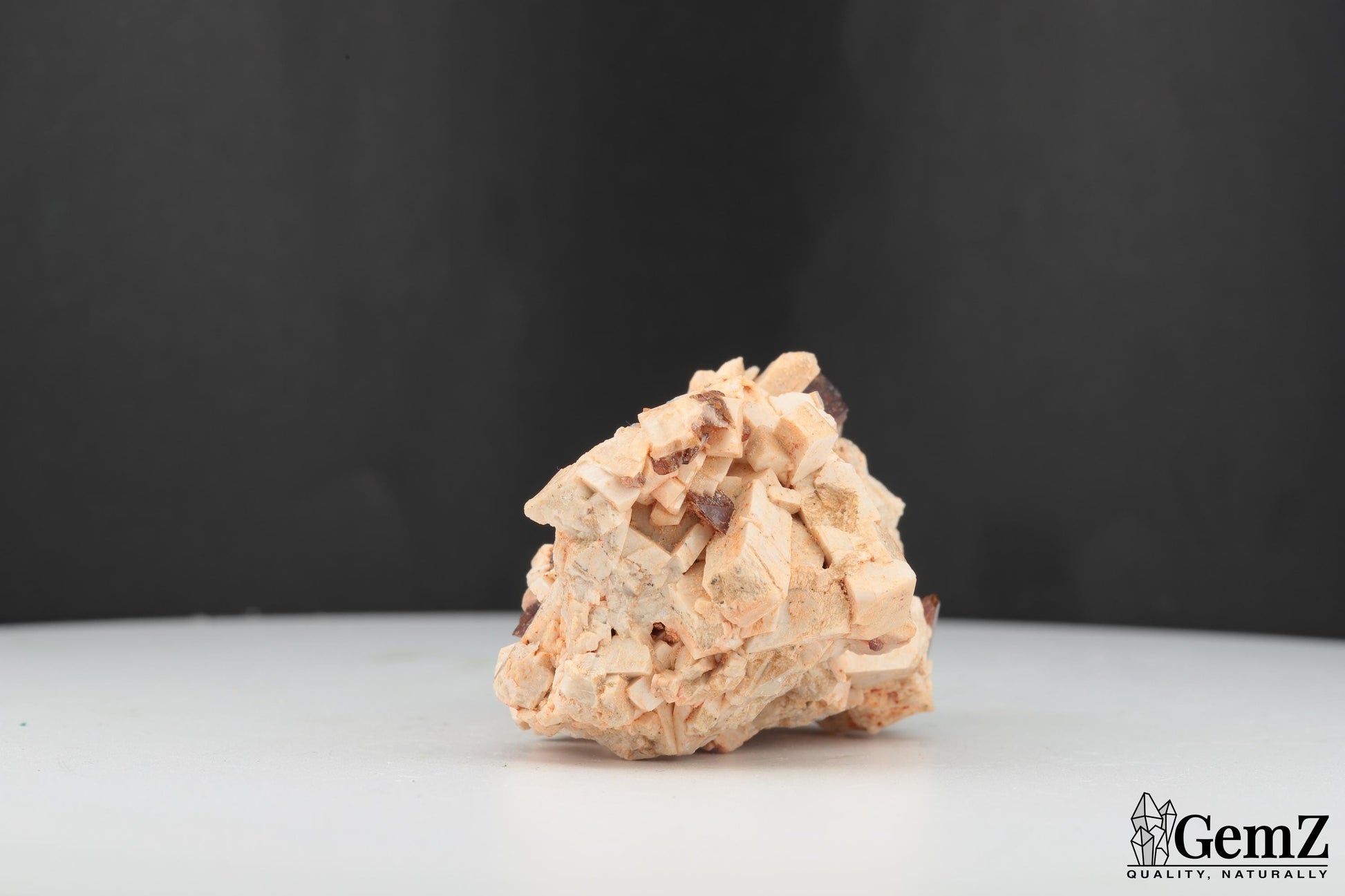 Composition : Ce spécimen exceptionnel met en valeur des cristaux brillants de titanite (sphène) d’un brun doré délicat, élégamment dispersés sur une matrice d’orthose beige clair. Les cristaux d’orthose, avec leur structure en blocs géométriques naturels, offrent un magnifique contraste textural et chromatique avec les éclats lumineux de la titanite.