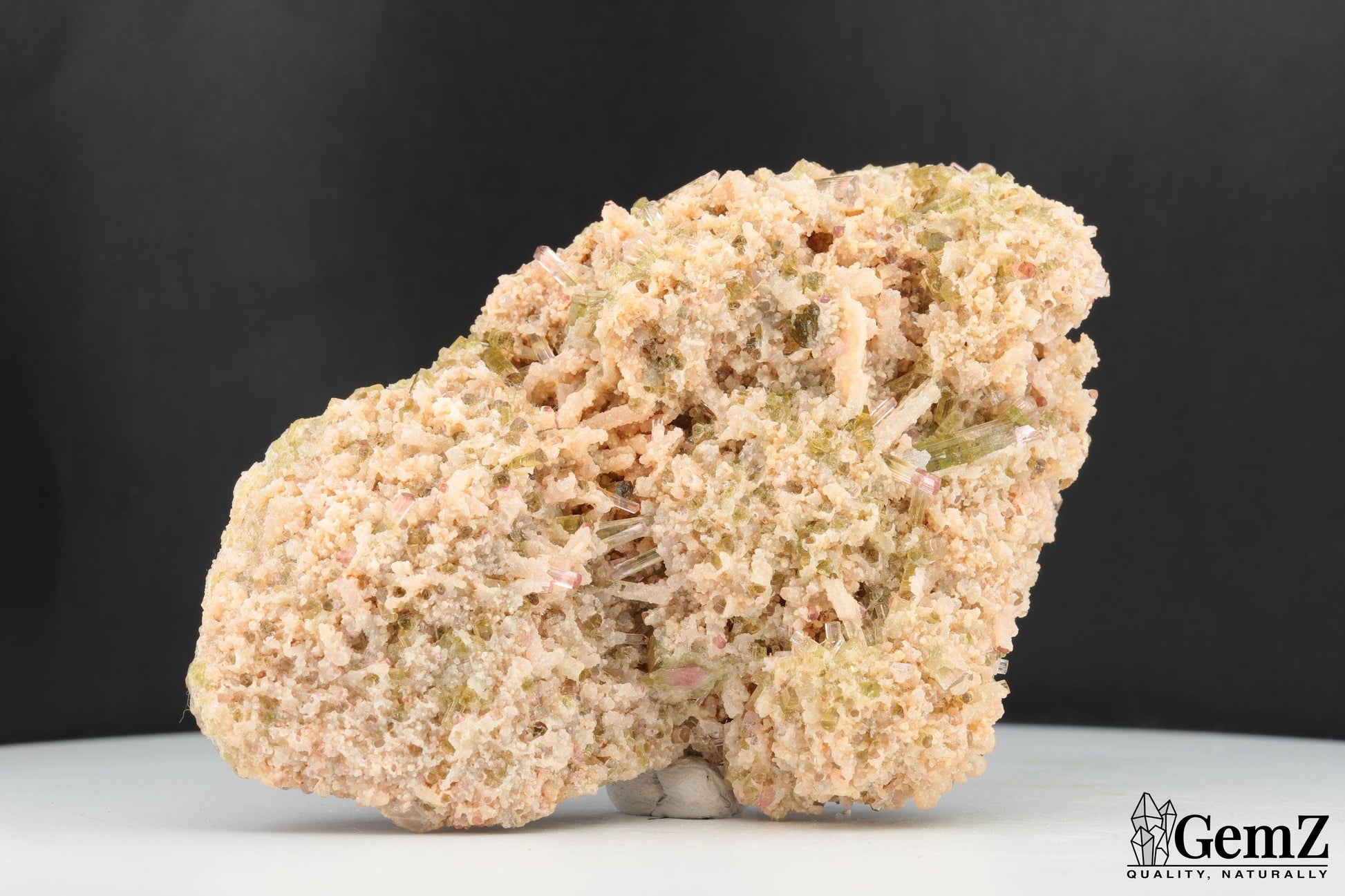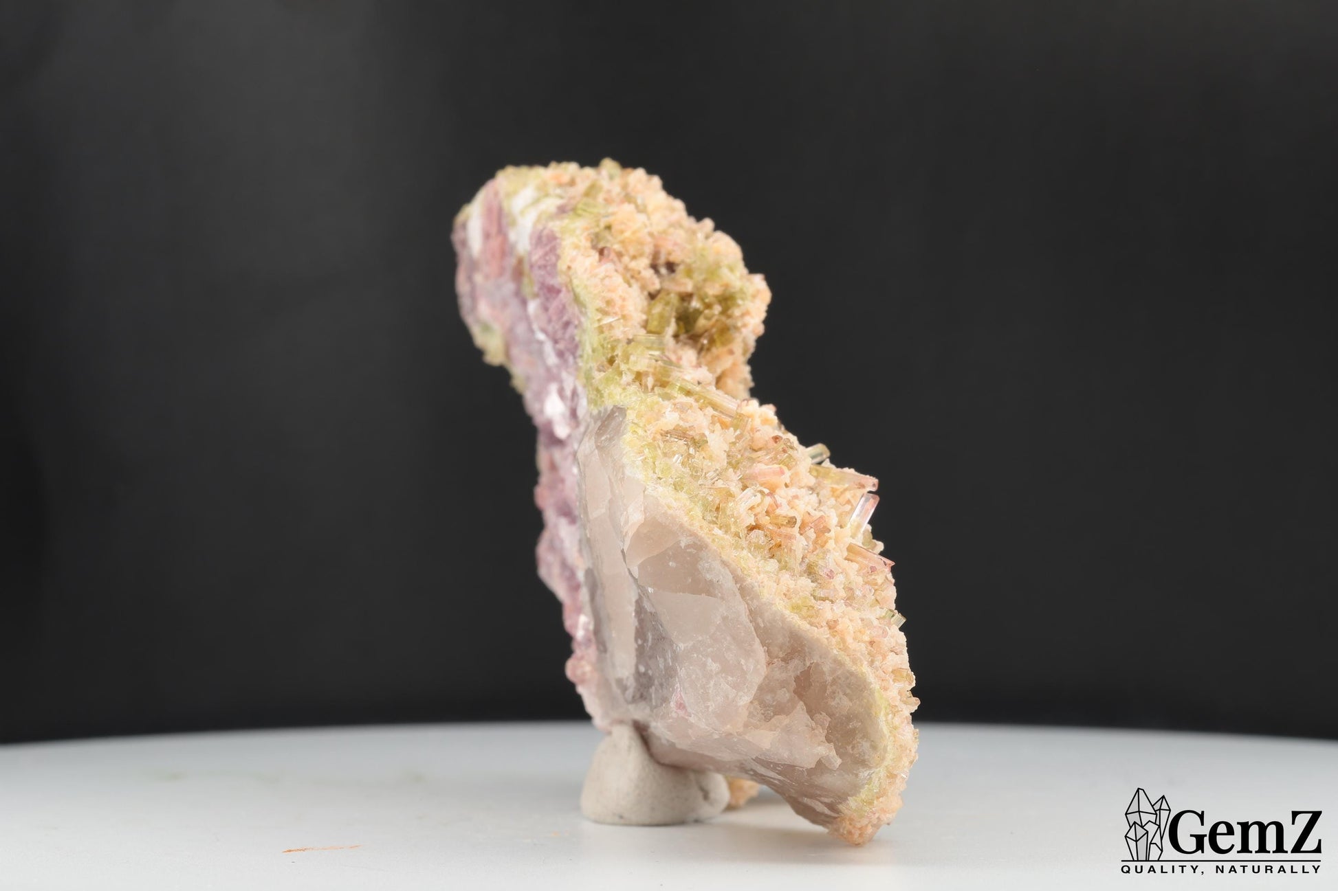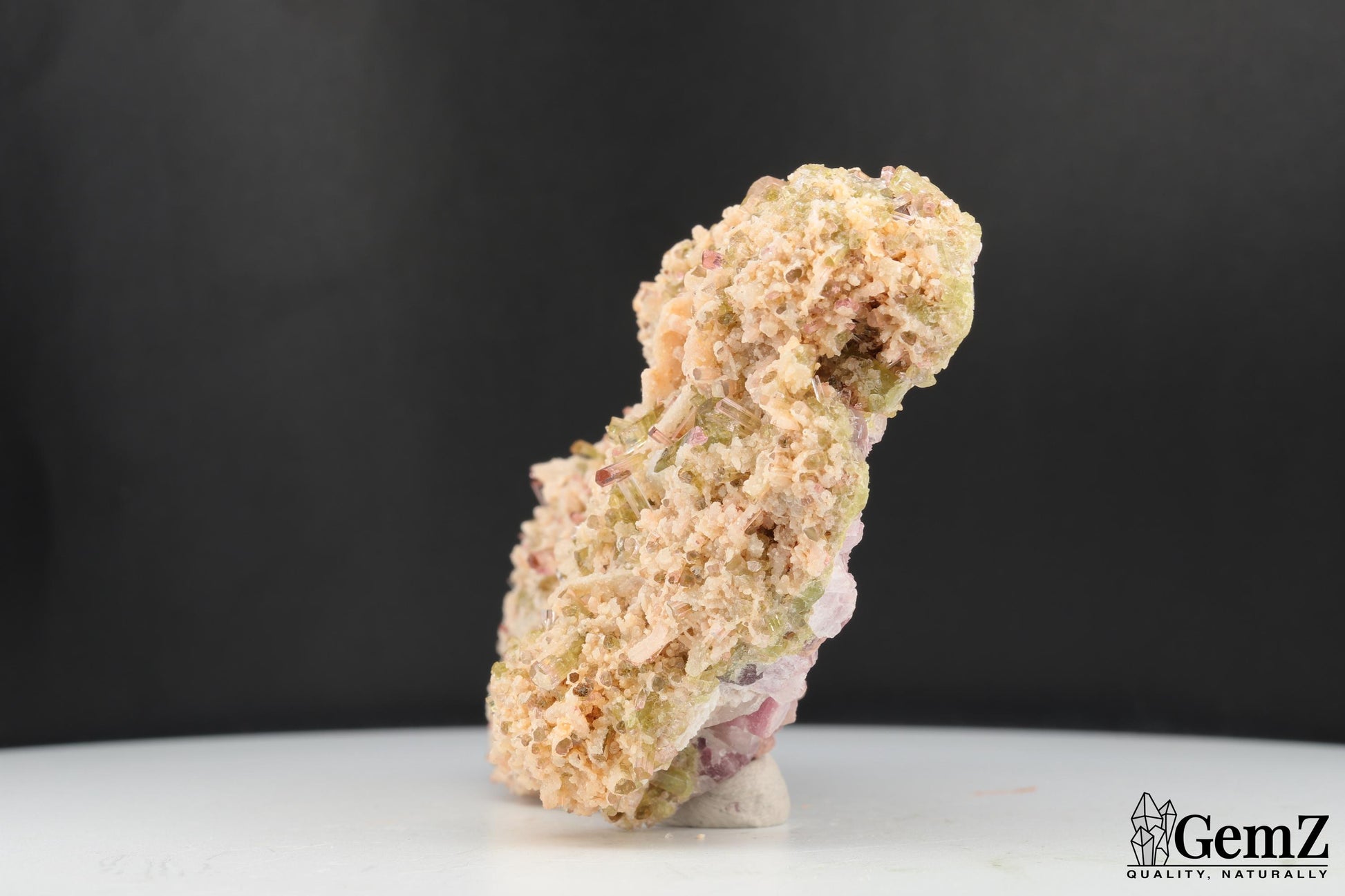 Admirez ce superbe spécimen naturel composé de fins cristaux de tourmaline multicolores, délicatement répartis sur une gangue de quartz et de lépidolite. Les nuances de vert, rose et blanc offrent un spectacle visuel unique et captivant, témoignant de la beauté des formations naturelles du Pakistan.