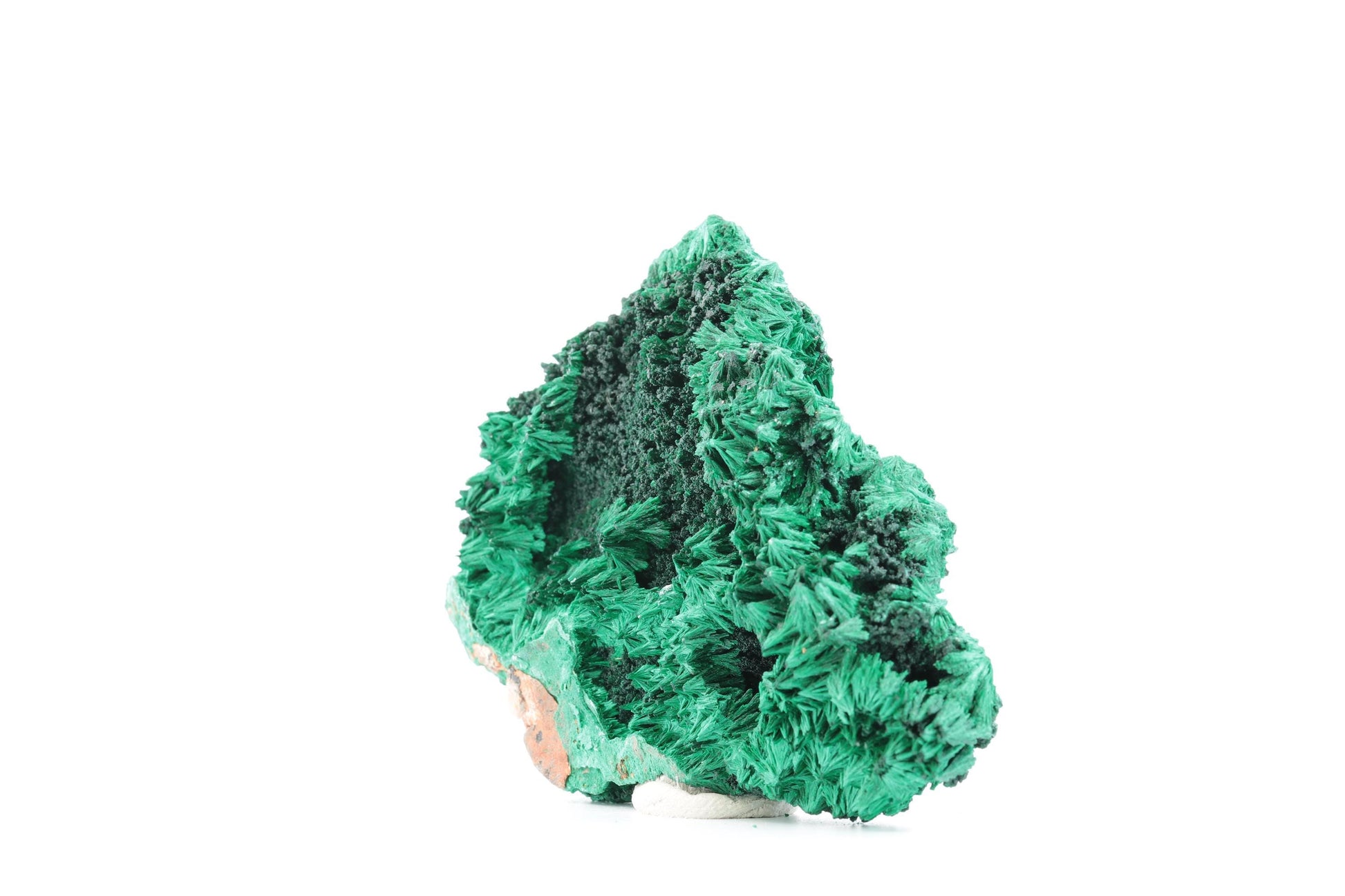Ce superbe spécimen de malachite fibreuse, issu des gisements du Congo, présente une structure fascinante combinant des formations fibreuses en éventail et une cavité centrale sombre et texturée. Les cristaux de malachite vert émeraude se déploient en bouquets élégants, offrant une apparence organique et dynamique. Le contraste entre les fibres soyeuses et les zones rugueuses ajoute un attrait visuel unique, faisant de cette pièce une véritable œuvre d'art minérale.