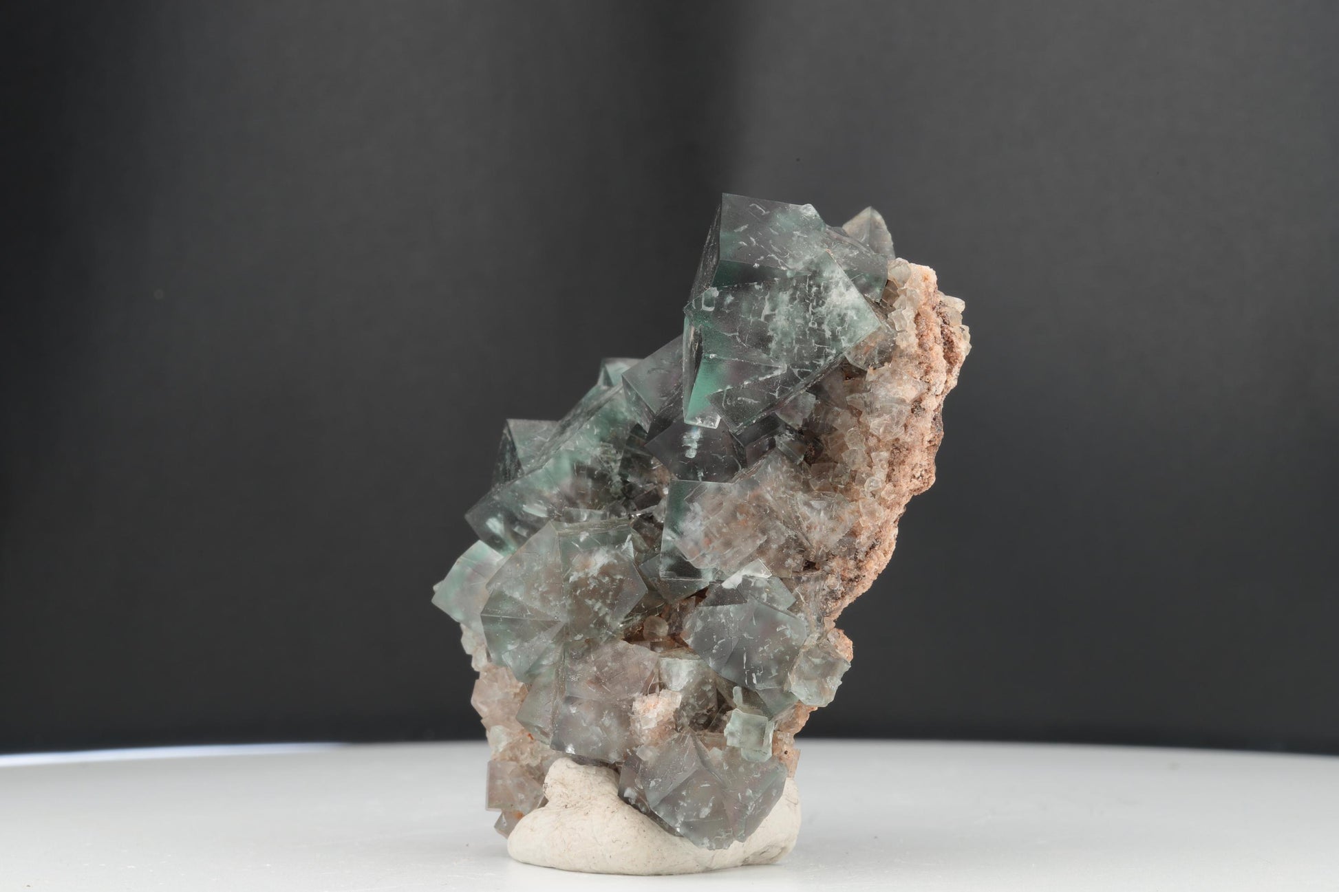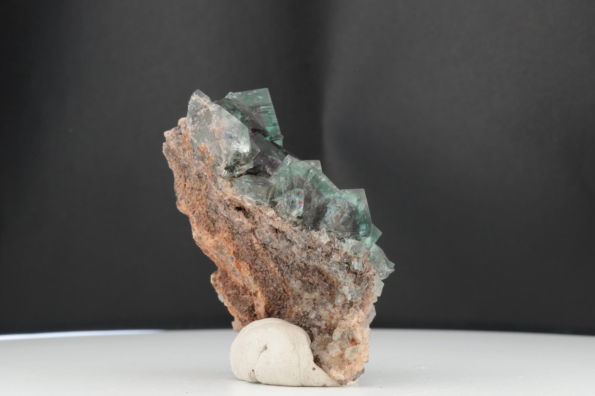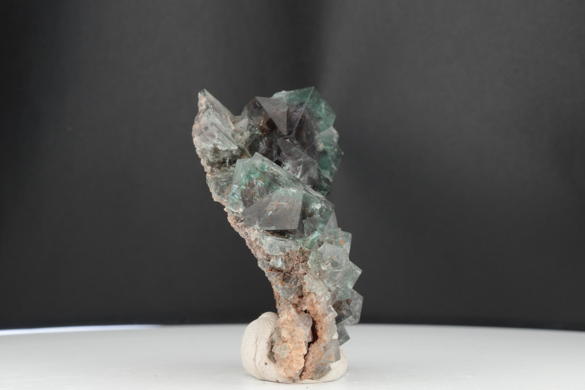 Ce superbe spécimen de fluorite verte provient de la célèbre mine Lady Annabella, Angleterre. Les cristaux cubiques sont harmonieusement disposés sur une matrice rocheuse naturelle, créant un contraste saisissant entre les faces vertes translucides et les tons terreux de la base. Les cristaux montrent des reflets sombres et des zones de transparence, accentués par des inclusions internes qui ajoutent un caractère unique. Sa formation en grappe confère à cette pièce une dimension architecturale, idéale pour les collectionneurs ou comme élément décoratif.