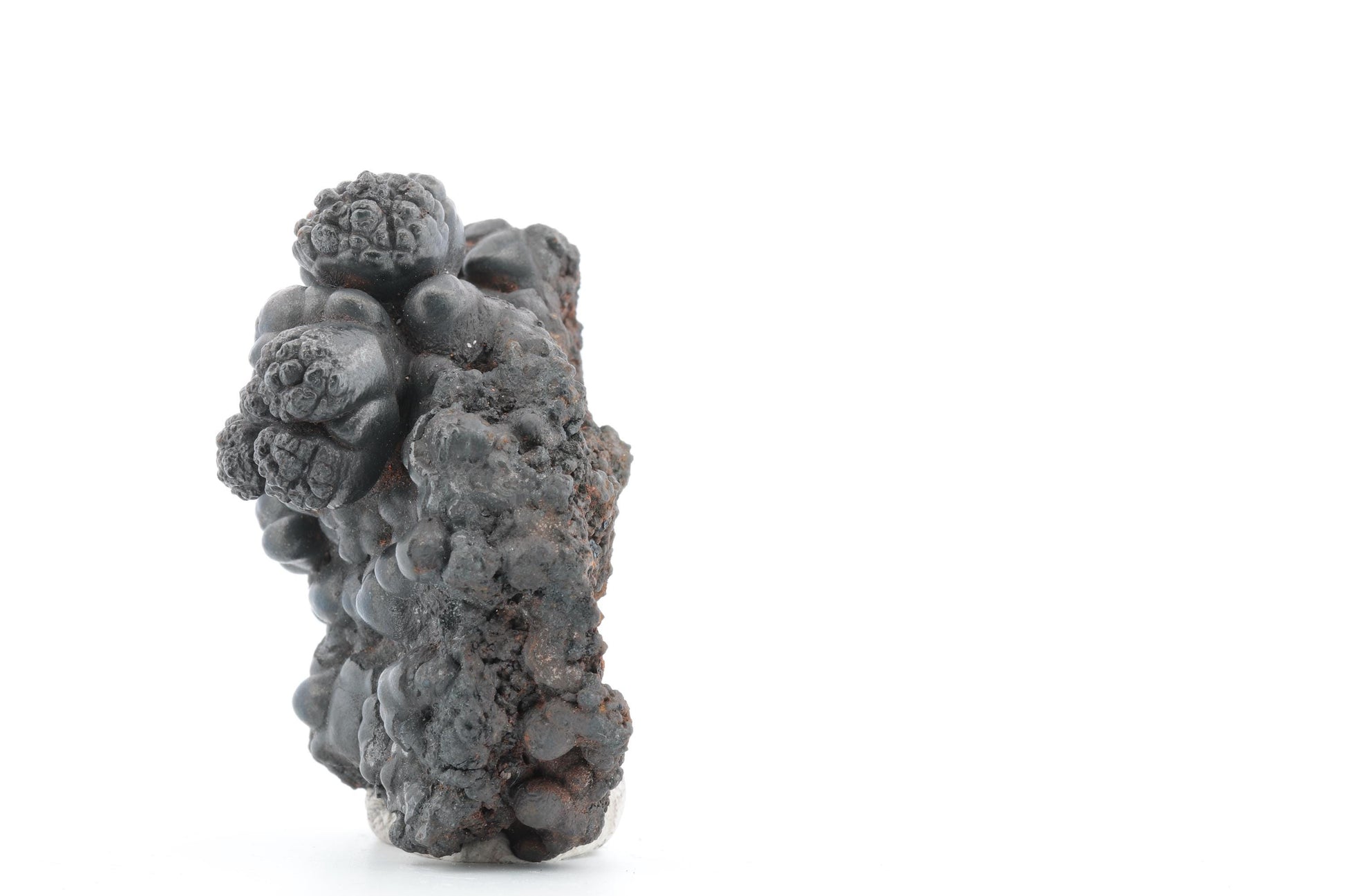 Ce superbe spécimen de goethite botryoïdale présente une structure arrondie et brillante, typique des formations naturelles de ce minéral. Sa surface noire métallique est sublimée par des nuances argentées et quelques accents brun-rouille, témoignant de son origine marocaine.