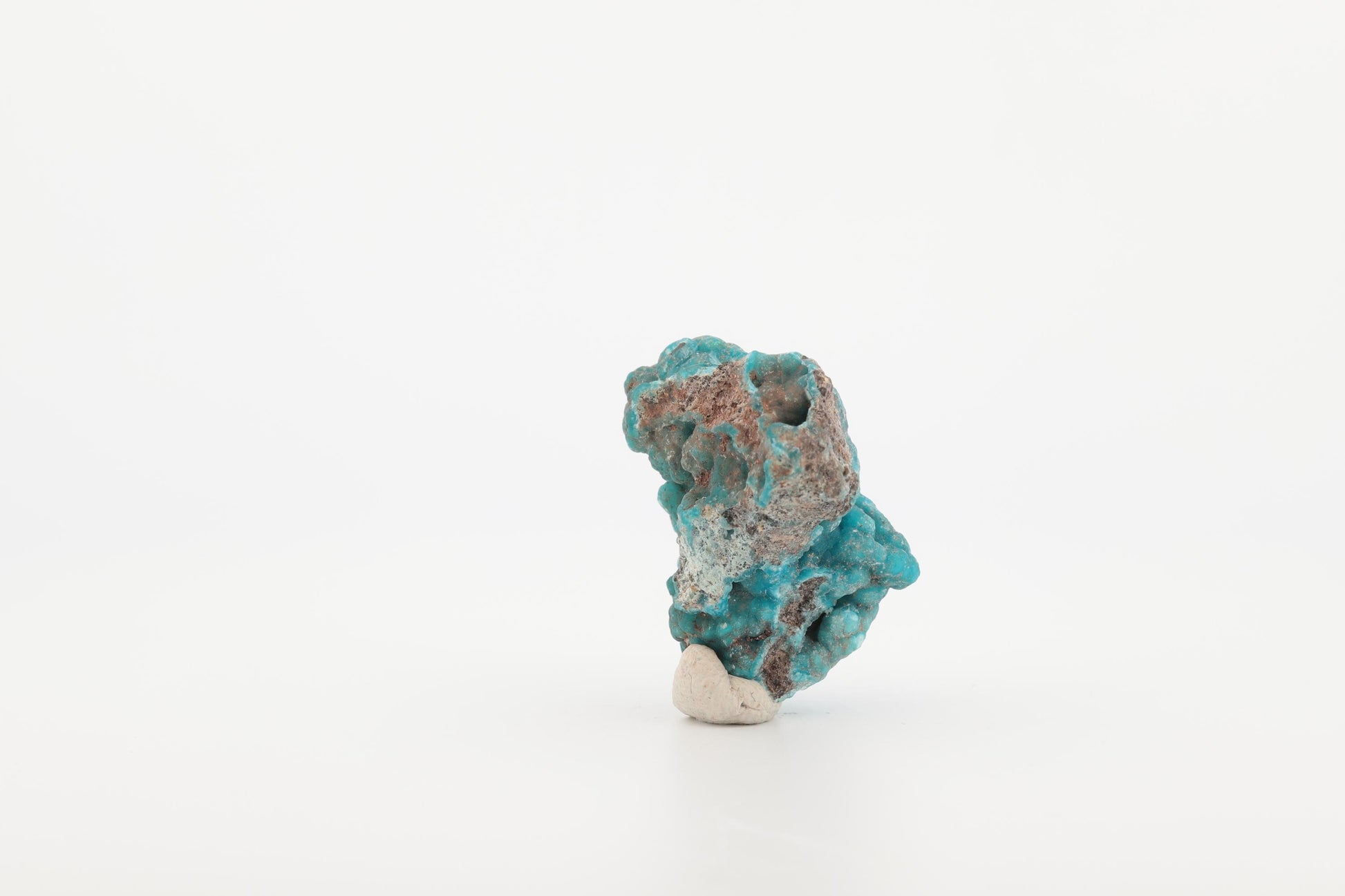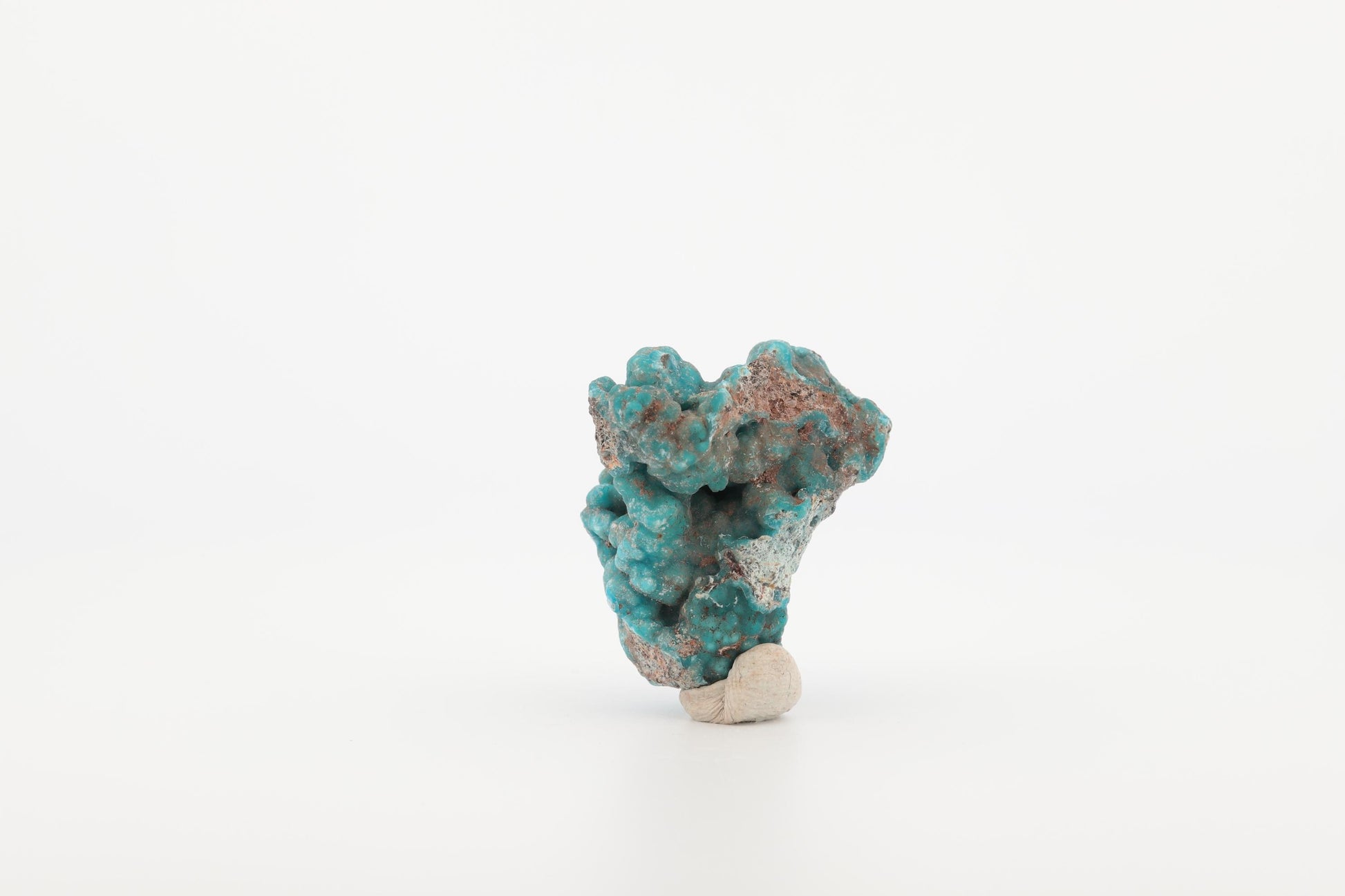 Ce spécimen compact d’hémimorphite présente une magnifique teinte bleu turquoise avec des formations botryoïdales caractéristiques. Les globules d’hémimorphite sont légèrement recouverts de dépôts terreux contrastants, soulignant le bleu éclatant de la pièce. Malgré sa petite taille, ce spécimen attire l'attention par ses formes uniques et sa texture naturelle, typique des gisements d'hémimorphite du Congo.