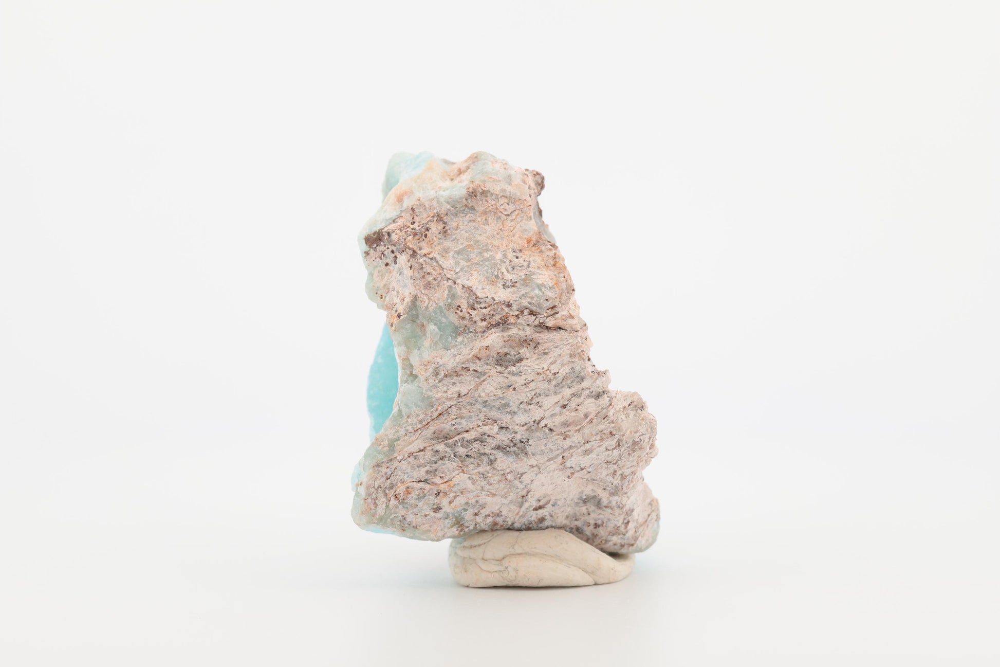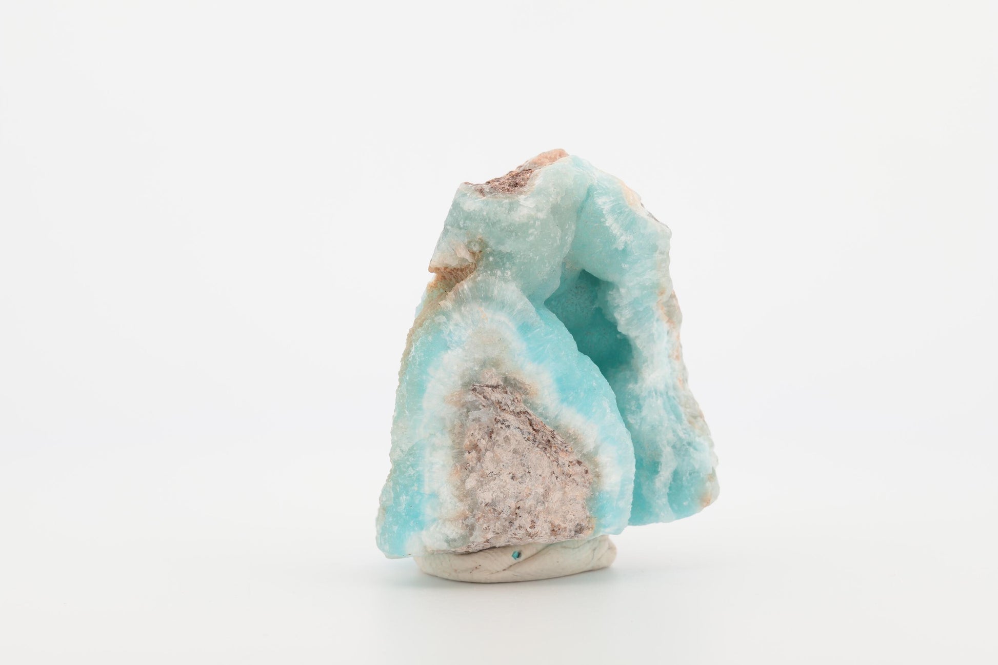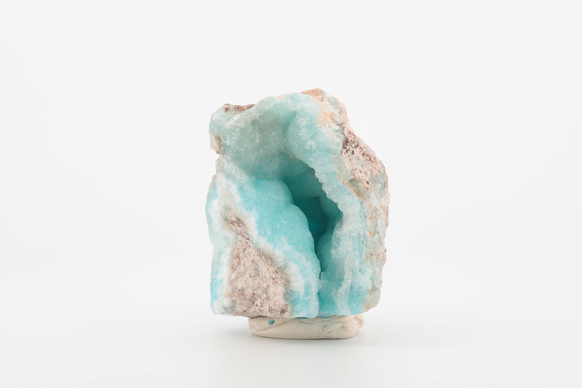 Ce magnifique spécimen d'hémimorphite du Congo se distingue par son bleu ciel intense et sa structure unique avec une cavité cristalline ouverte, qui ajoute profondeur et dimension. La pièce présente une matrice brunâtre naturelle et des veines blanches qui contrastent délicatement avec le bleu, créant un effet visuel captivant. Sa taille compacte et ses détails naturels en font une pièce exceptionnelle pour les collectionneurs et un excellent choix pour la lithothérapie.