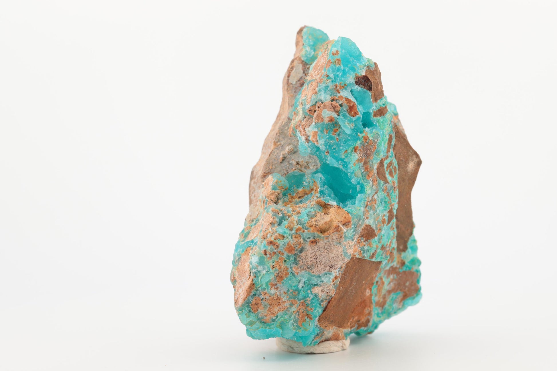 Cette remarquable pièce d'hémimorphite présente une magnifique couleur turquoise vive avec des formations botryoïdales, caractéristiques de cette pierre. Le contraste saisissant entre les zones cristallines bleu vif et la matrice brunâtre naturelle souligne la beauté brute de cette pièce. La texture arrondie et lisse des cristaux donne une apparence presque liquide, ajoutant une profondeur visuelle captivante. Ce spécimen, pesant 171,5 g, est parfait pour les collectionneurs de minéraux ou pour ceux qui recherchent une pièce de lithothérapie unique.