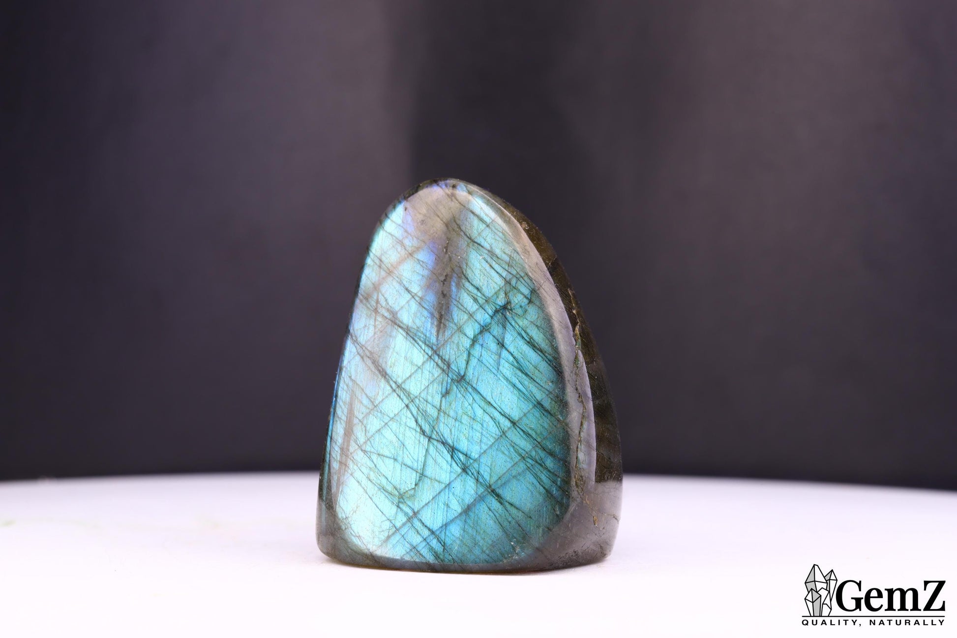 La labradorite est connue pour son phénomène optique unique, la labradorescence. Ce jeu de lumière fascinant est causé par l’interférence des rayons lumineux avec les fines couches de minéraux internes, révélant des éclats irisés inimitables.