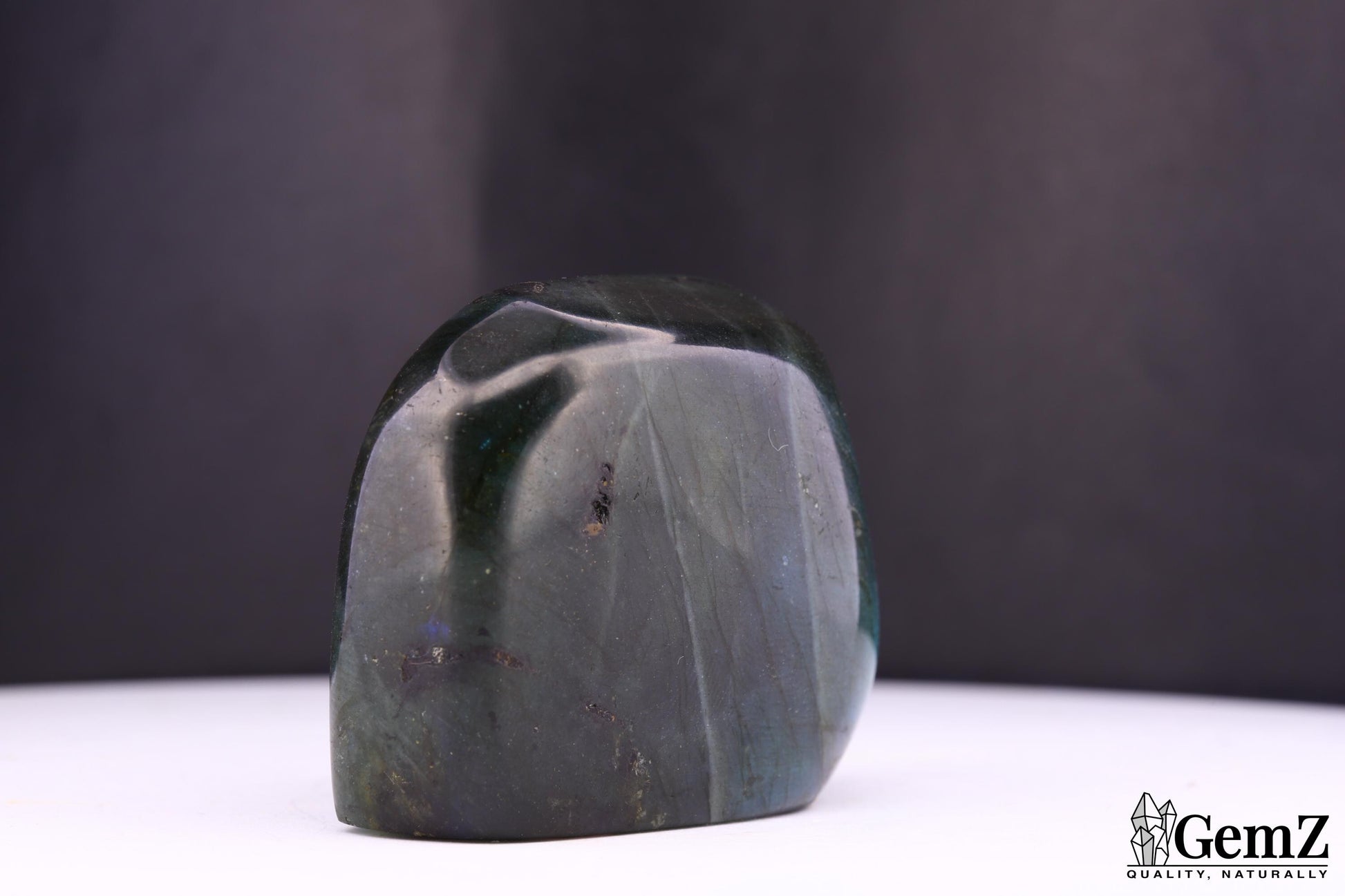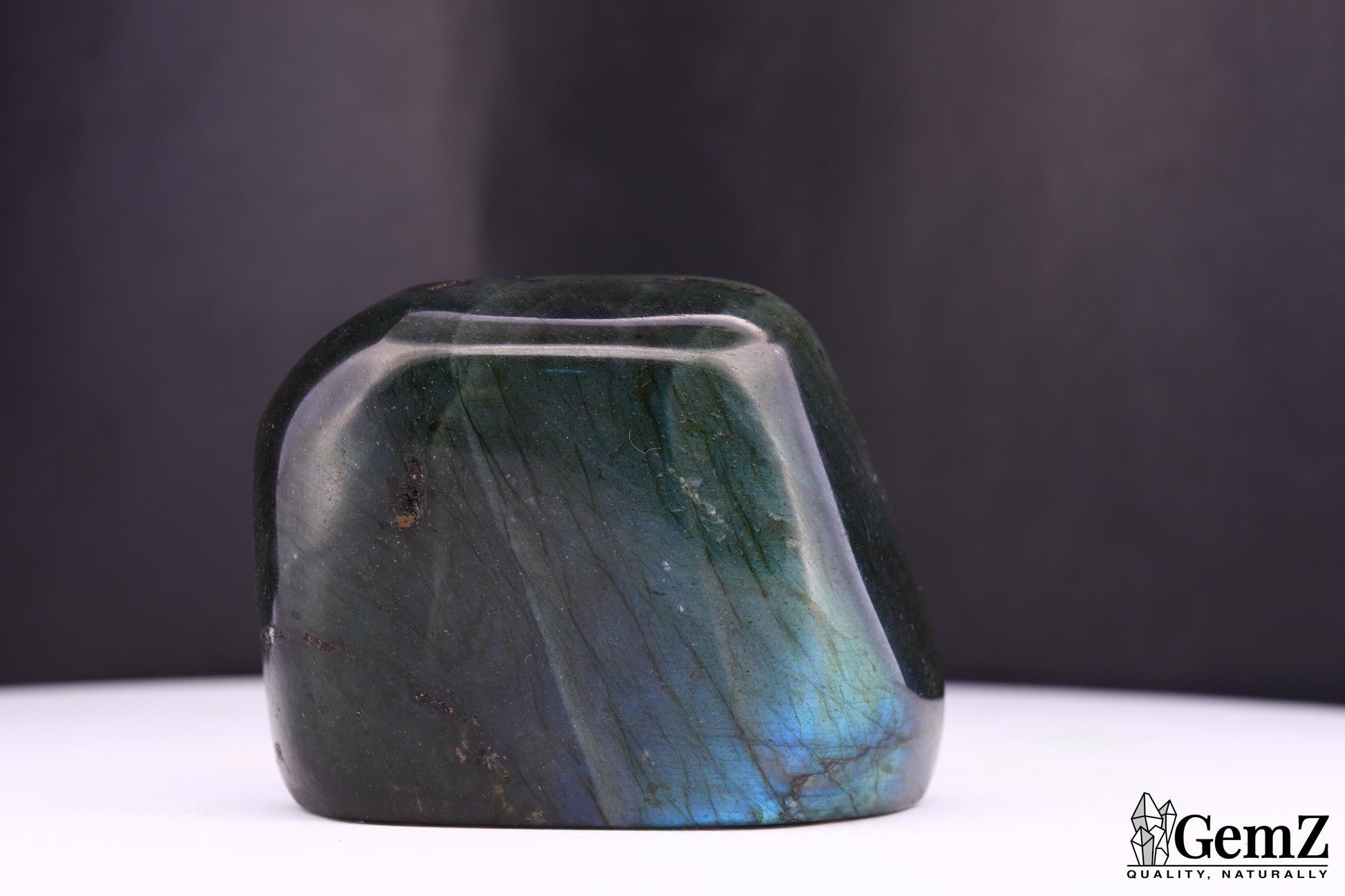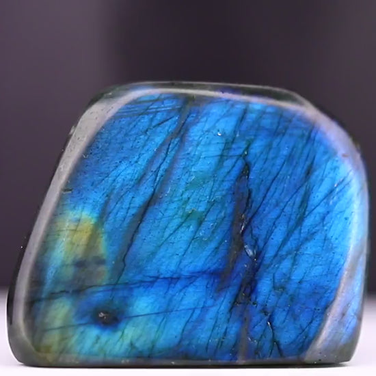 Cette labradorite exceptionnelle de 88g offre des reflets hypnotiques bleu électrique et vert profond, magnifiquement révélés par sa finition polie. Chaque angle dévoile une nouvelle facette de lumière, rendant cette pierre particulièrement fascinante.