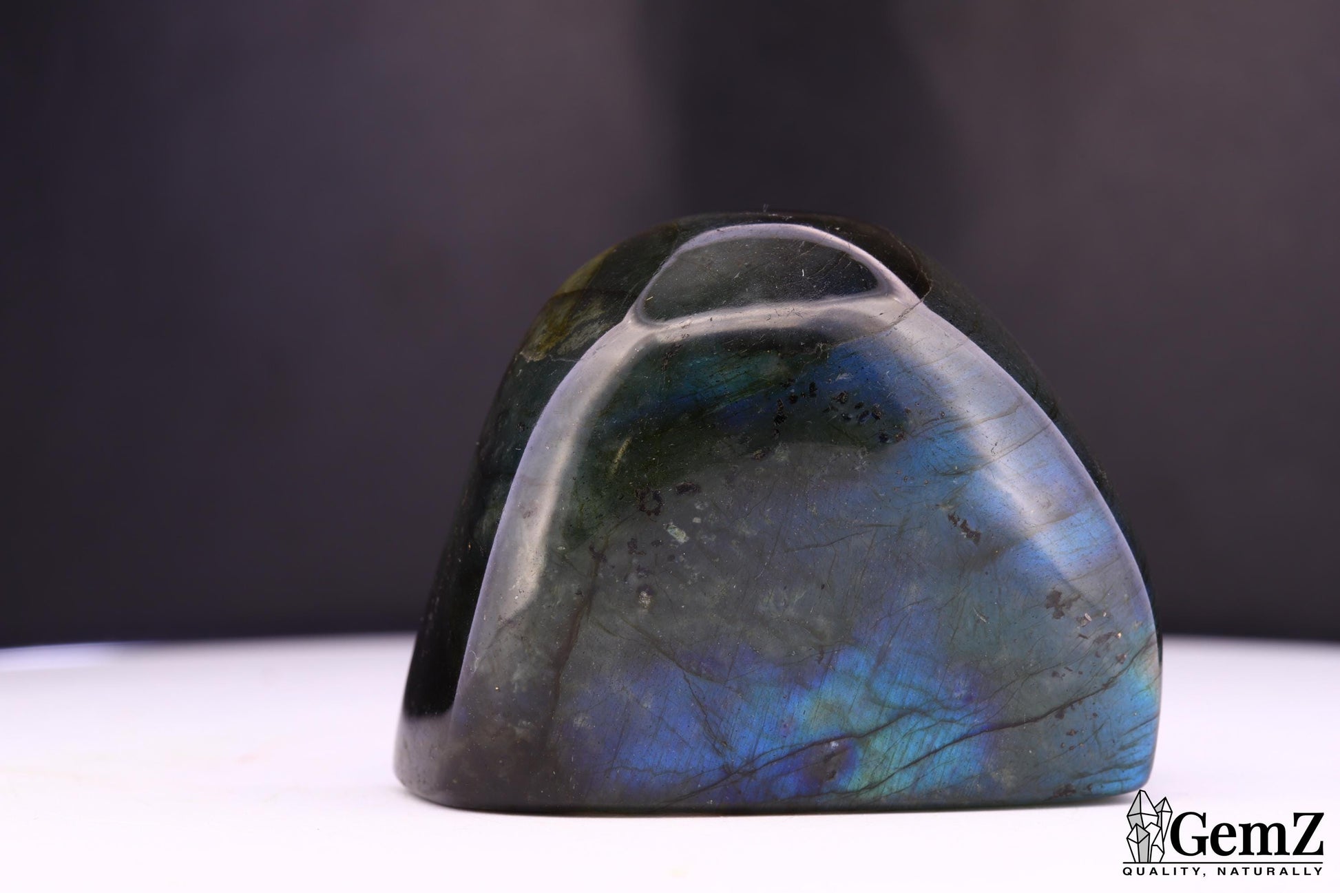 Cette superbe labradorite polie dévoile des reflets bleus captivants qui changent selon l’angle de lumière. Sa forme douce et arrondie met en valeur la beauté de ses veines naturelles et de sa surface lisse.