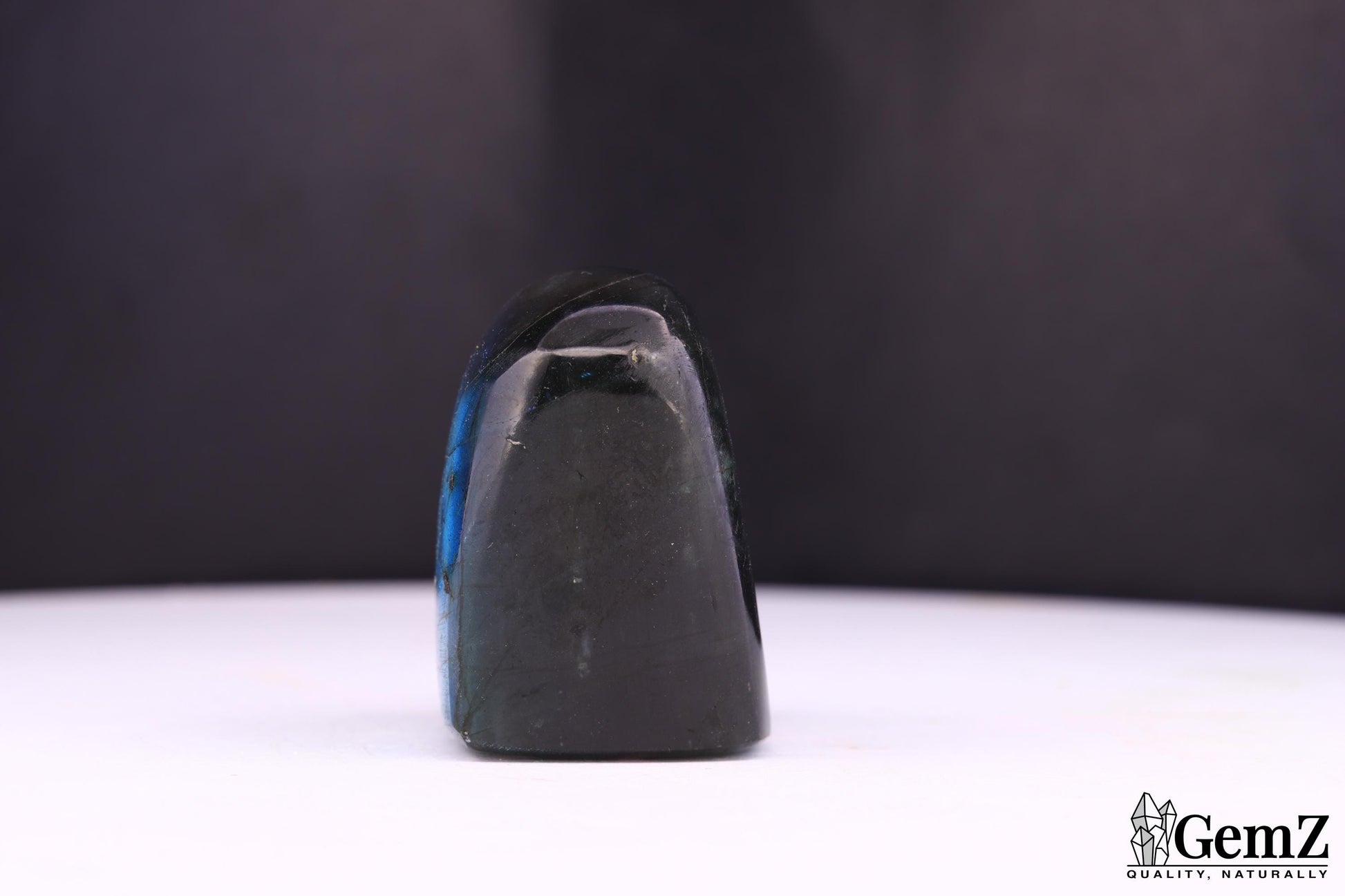 Cette élégante labradorite polie dévoile des reflets bleutés profonds et fascinants. Sa forme compacte et ses inclusions naturelles en font un joyau unique et captivant à admirer.