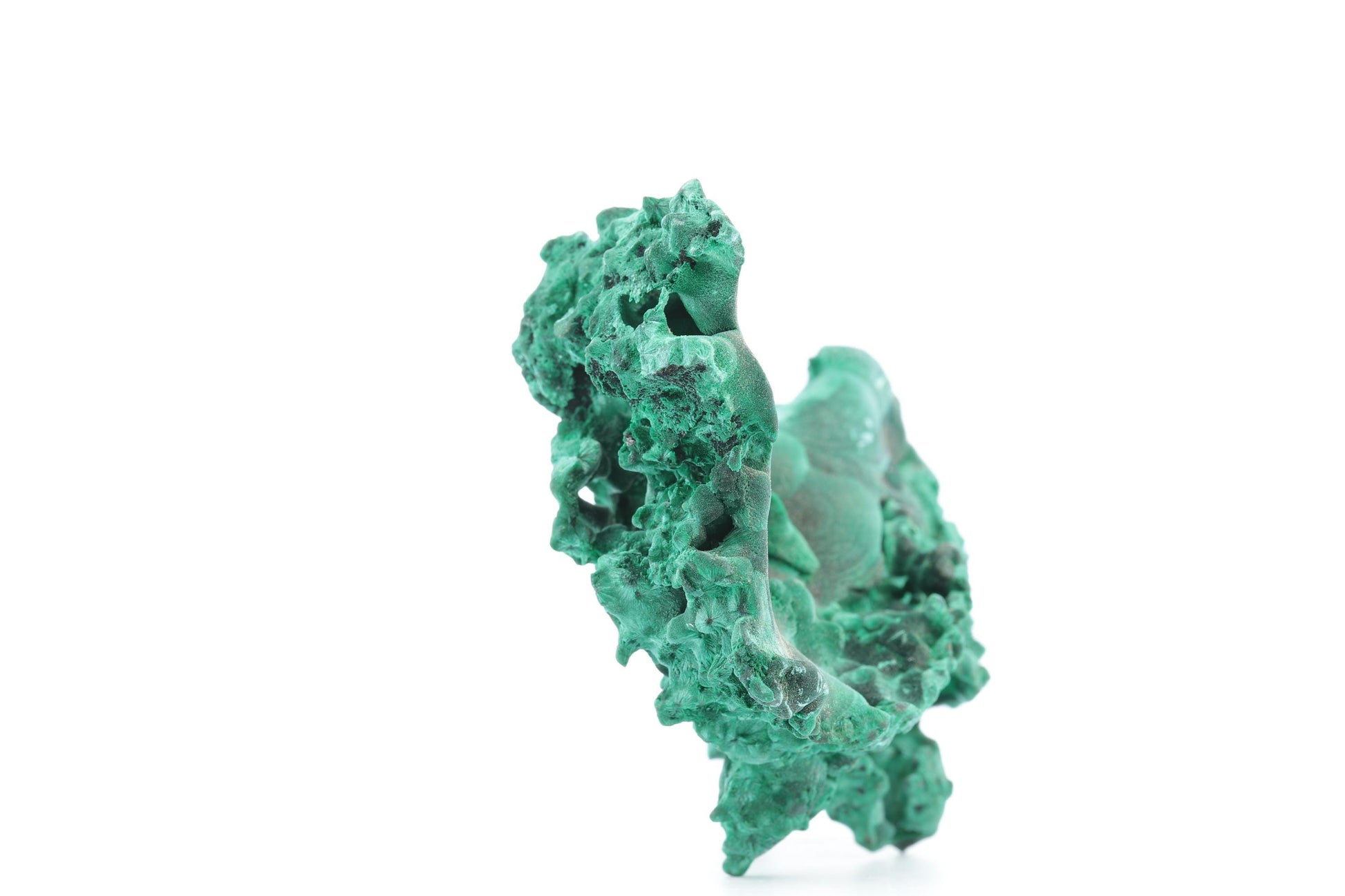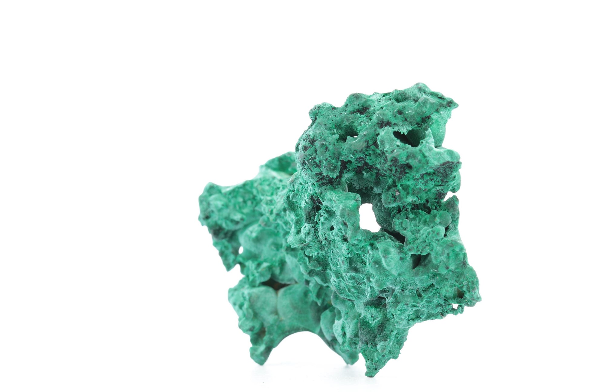 Ce spécimen remarquable combine les formations botryoïdales et fibreuses, mettant en valeur la diversité et la richesse de la malachite du Congo. Les surfaces lisses et arrondies typiques de la malachite botryoïdale contrastent magnifiquement avec les zones fibreuses aux textures délicates et détaillées. Les cavités naturelles et les reliefs complexes ajoutent de la profondeur à cette pièce, tandis que la teinte vert émeraude intense reflète la lumière de manière captivante. Ce spécimen est une pièce exceptionnelle, idéale pour les collectionneurs ou comme élément décoratif raffiné.