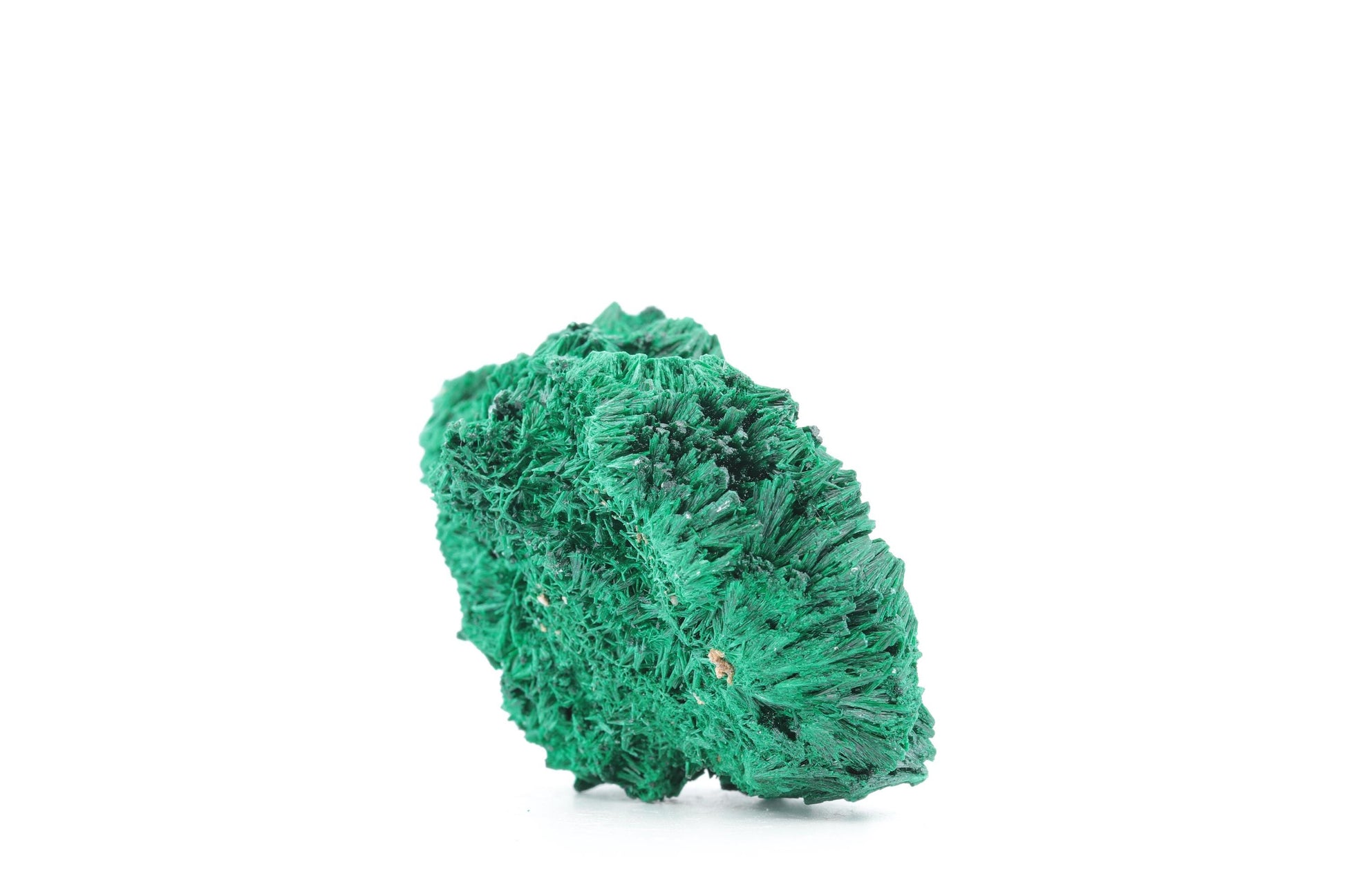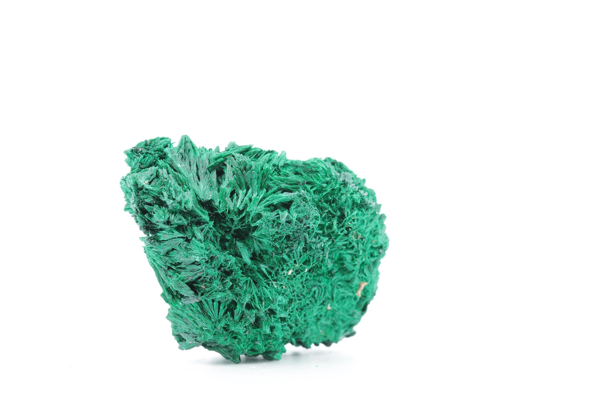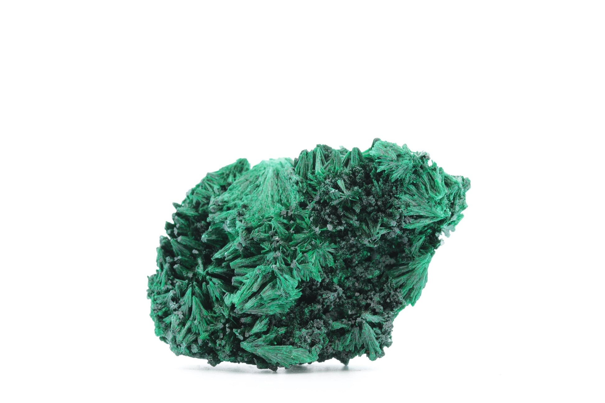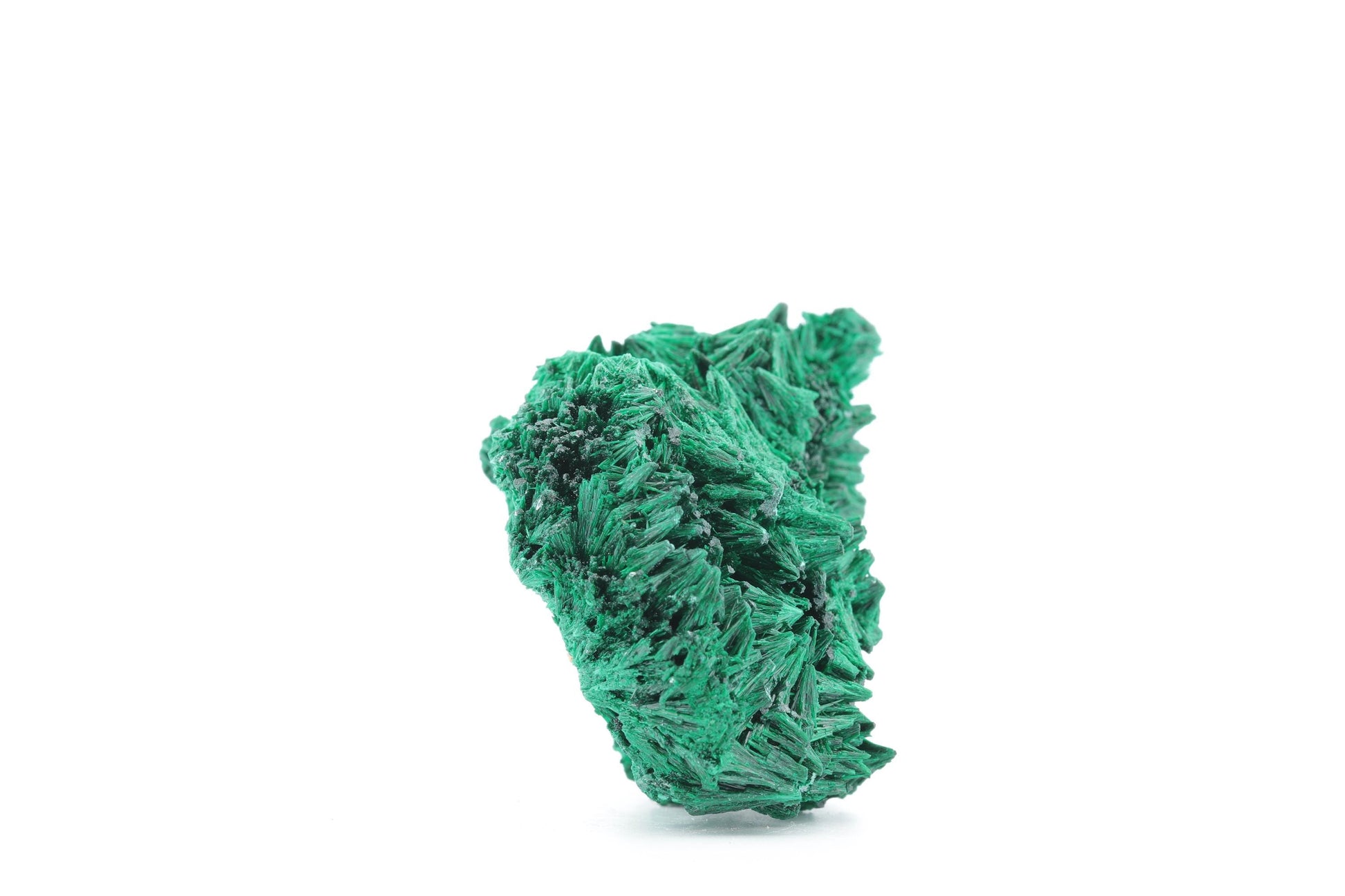 Description Technique : Ce superbe spécimen de malachite fibreuse, provenant des riches gisements minéralogiques du Congo, se distingue par ses formations cristallines en fines aiguilles convergentes, rappelant de petites gerbes naturelles. Sa teinte verte profonde et intense, typique des malachites de haute qualité, est sublimée par des reflets soyeux qui captent et reflètent subtilement la lumière. La texture complexe et tridimensionnelle de cette pièce en fait un spécimen unique, parfait pour les collectionneurs et les amateurs de minéraux rares.