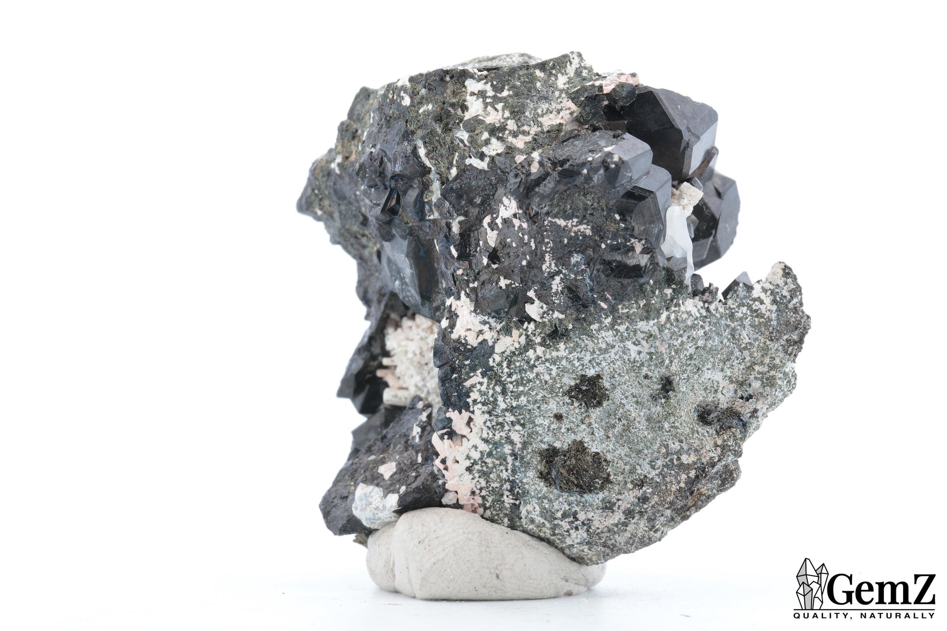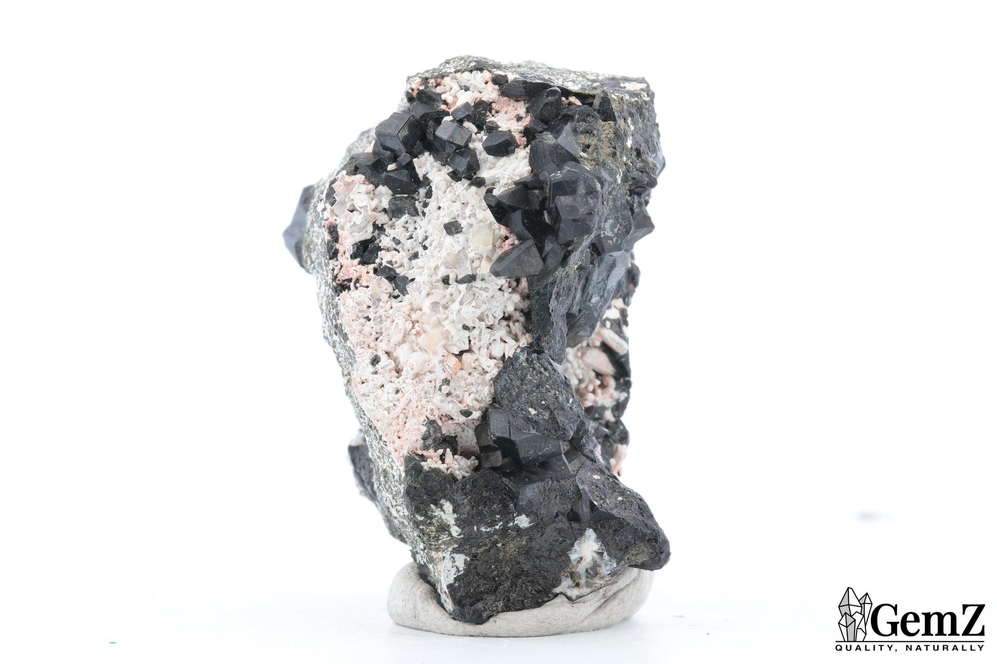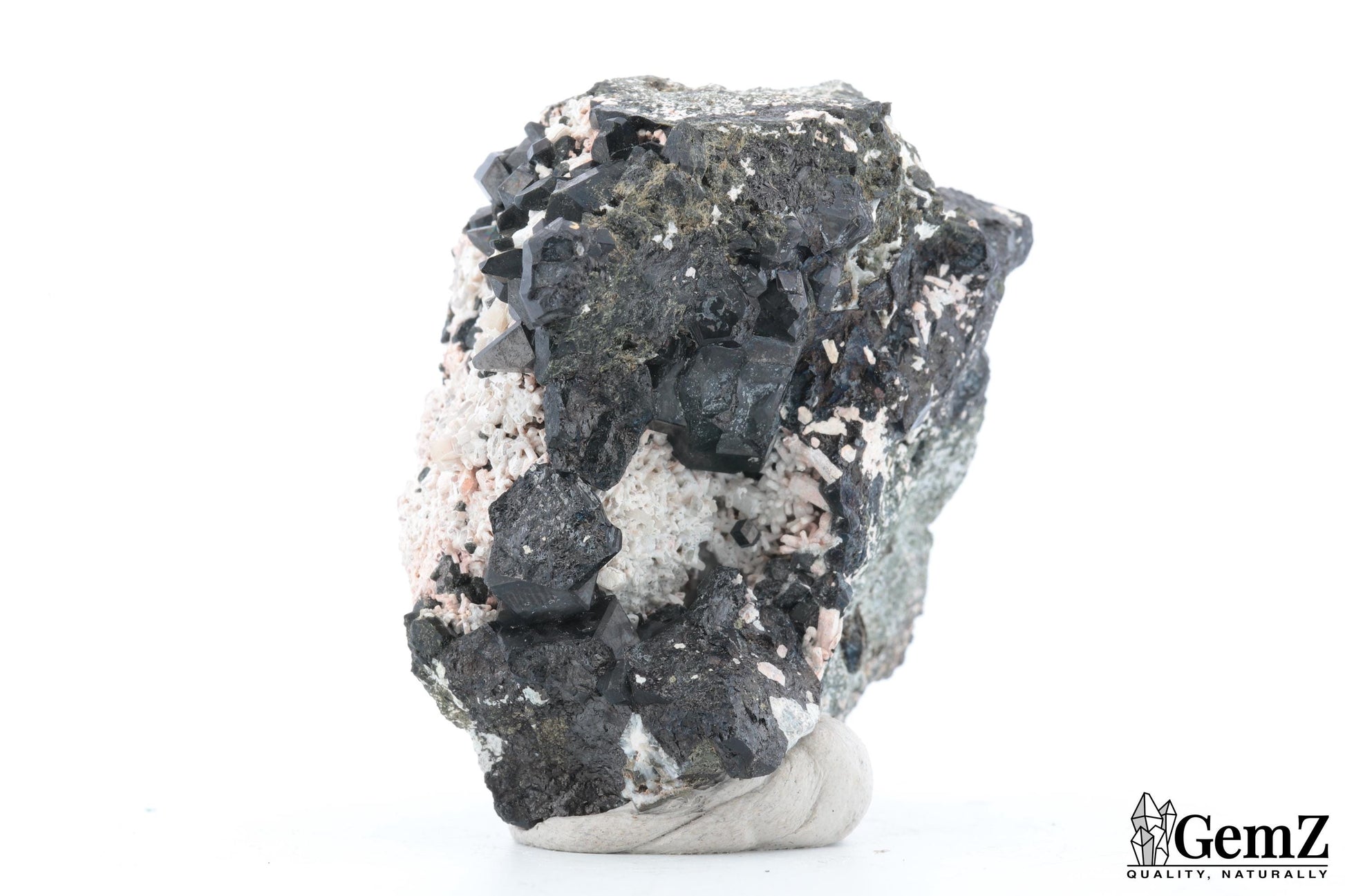 Ce superbe spécimen présente des cristaux de mélanite bien formés et brillants, nichés sur une gangue naturelle associée à des traces d'orthose. Les tons sombres de la mélanite contrastent harmonieusement avec la texture plus claire de la matrice, mettant en valeur l'élégance brute de cette pièce.