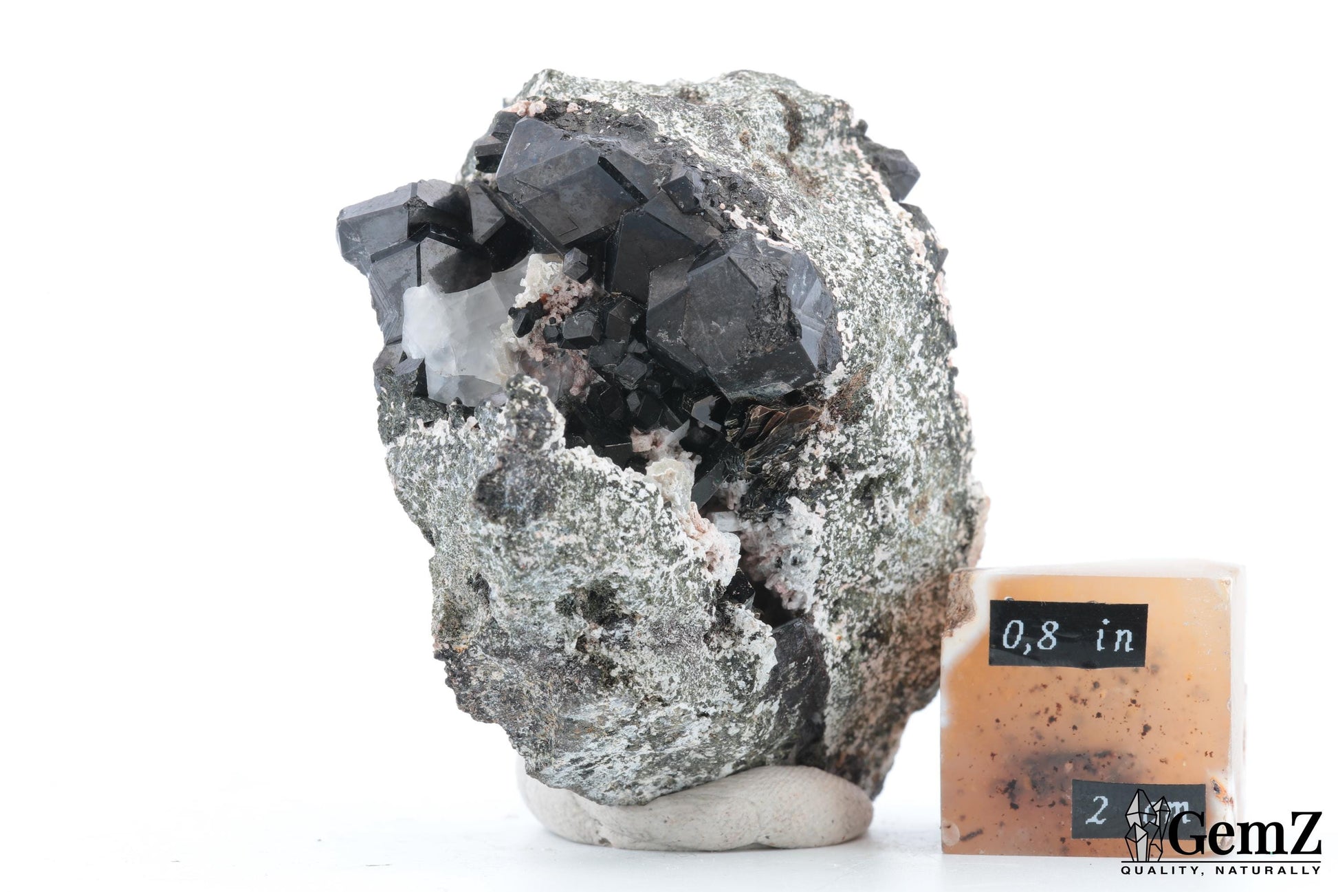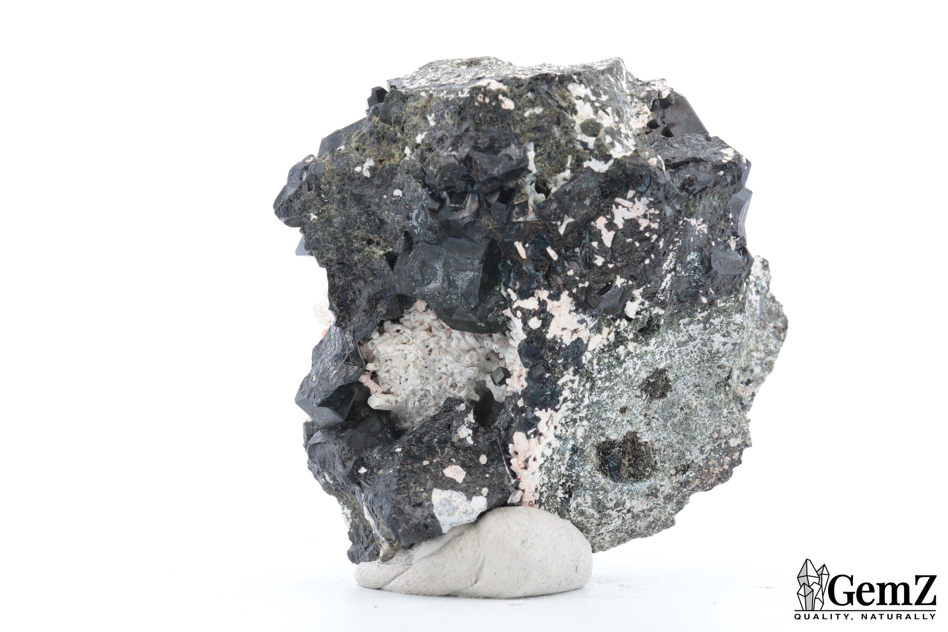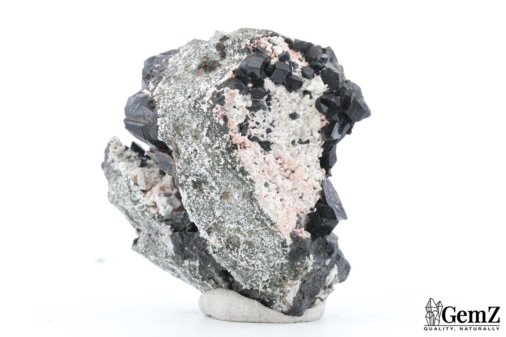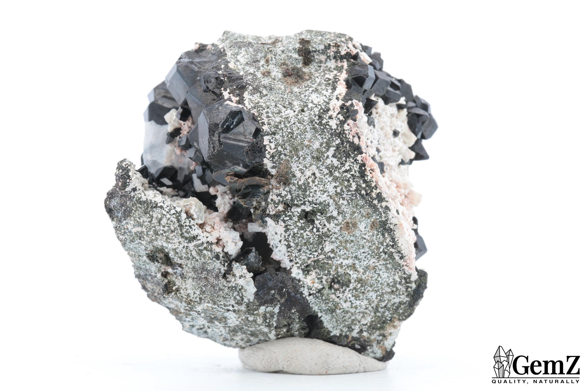 Ce superbe spécimen présente des cristaux de mélanite bien formés et brillants, nichés sur une gangue naturelle associée à des traces d'orthose. Les tons sombres de la mélanite contrastent harmonieusement avec la texture plus claire de la matrice, mettant en valeur l'élégance brute de cette pièce.