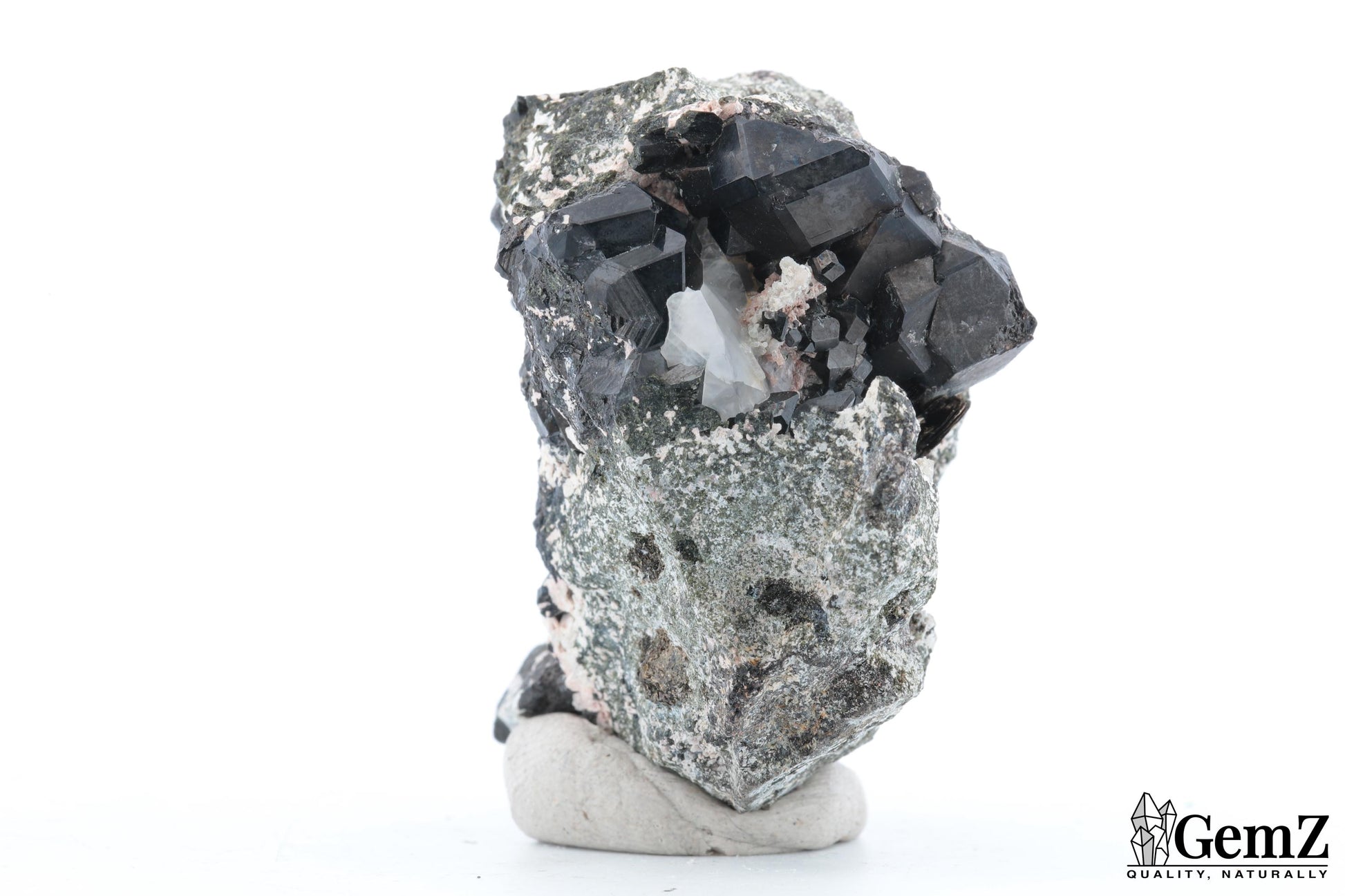 La mélanite est une variété rare de grenat andradite, connue pour sa teinte noire intense et sa brillance exceptionnelle. Elle se forme généralement dans des environnements riches en calcium et fer, souvent associés à des roches métamorphiques et ignées.