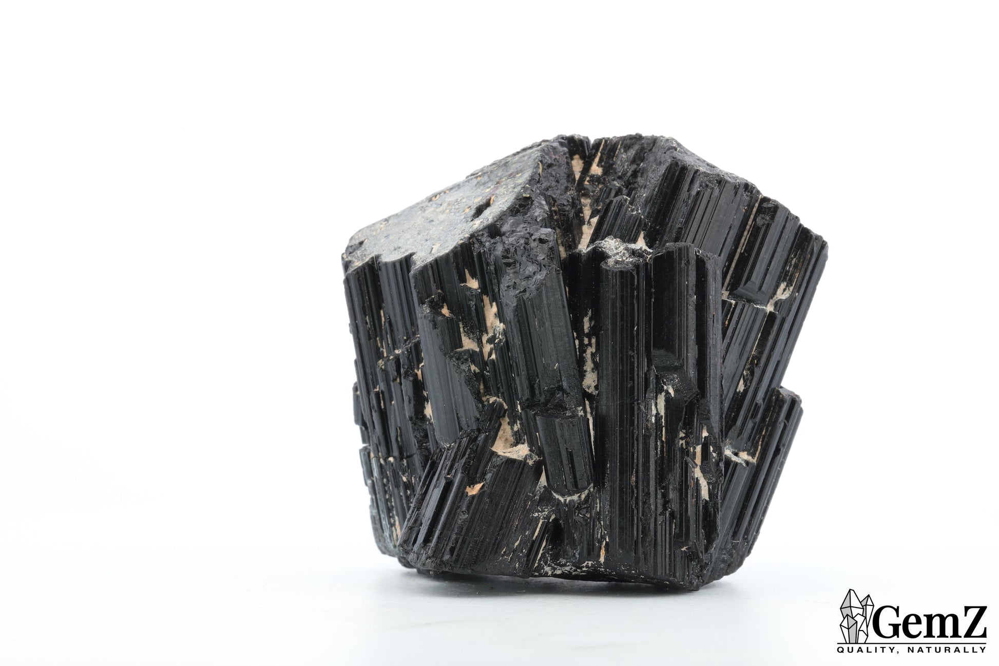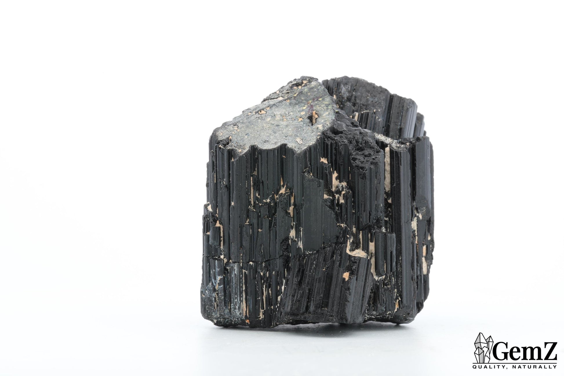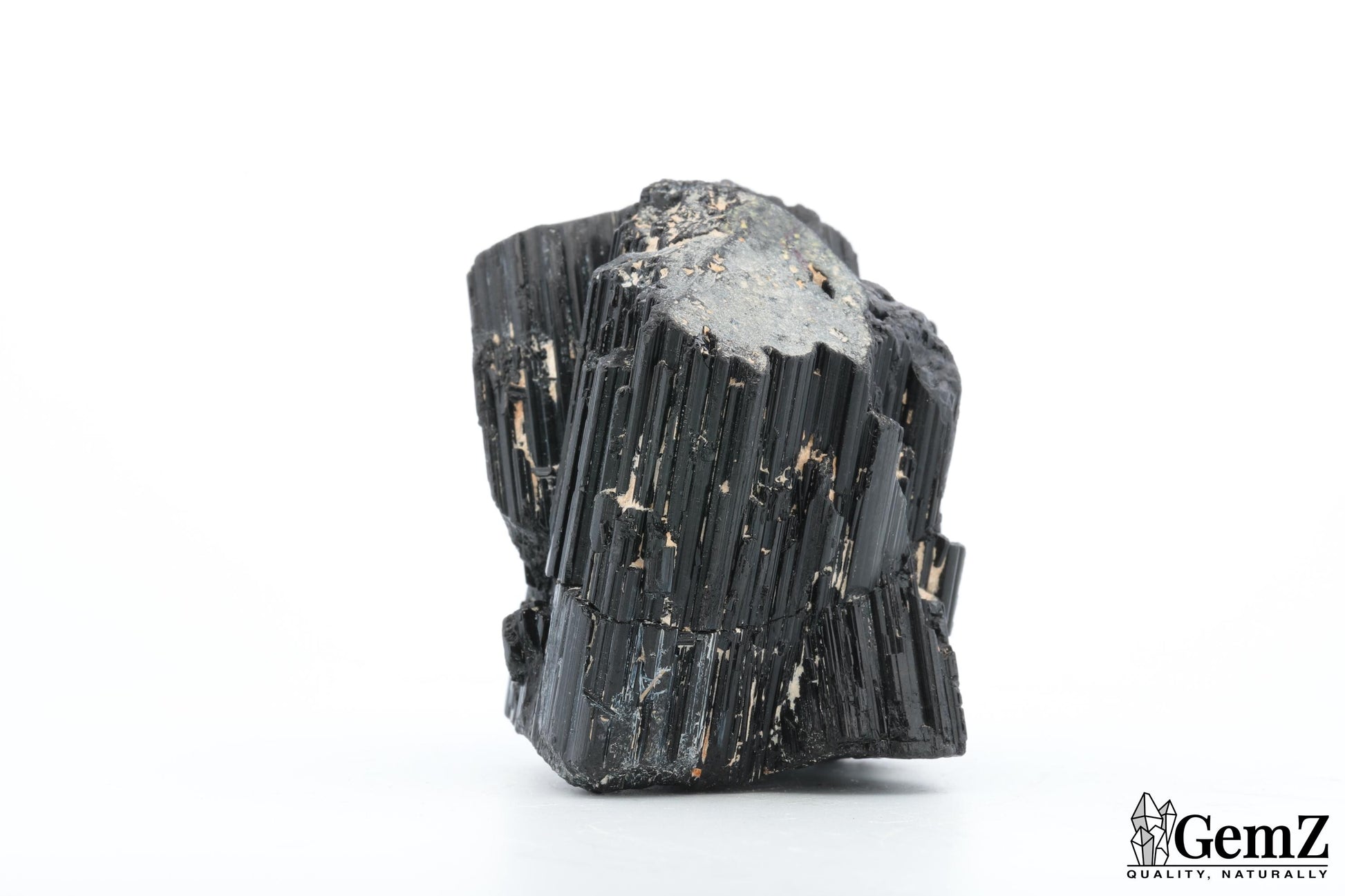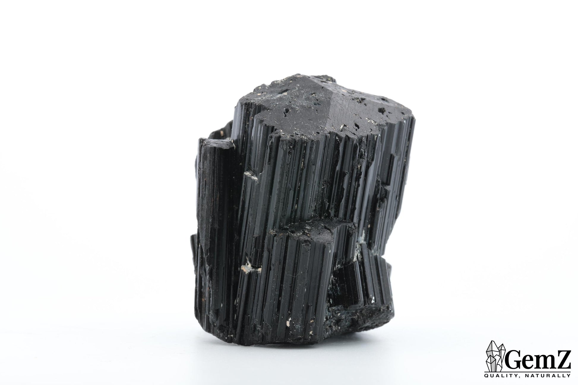 La tourmaline noire est une variété riche en fer, ce qui lui confère sa couleur intense et ses propriétés conductrices uniques. Elle se forme généralement dans des veines hydrothermales ou des pegmatites, et est appréciée pour ses structures prismatiques parfaitement définies.