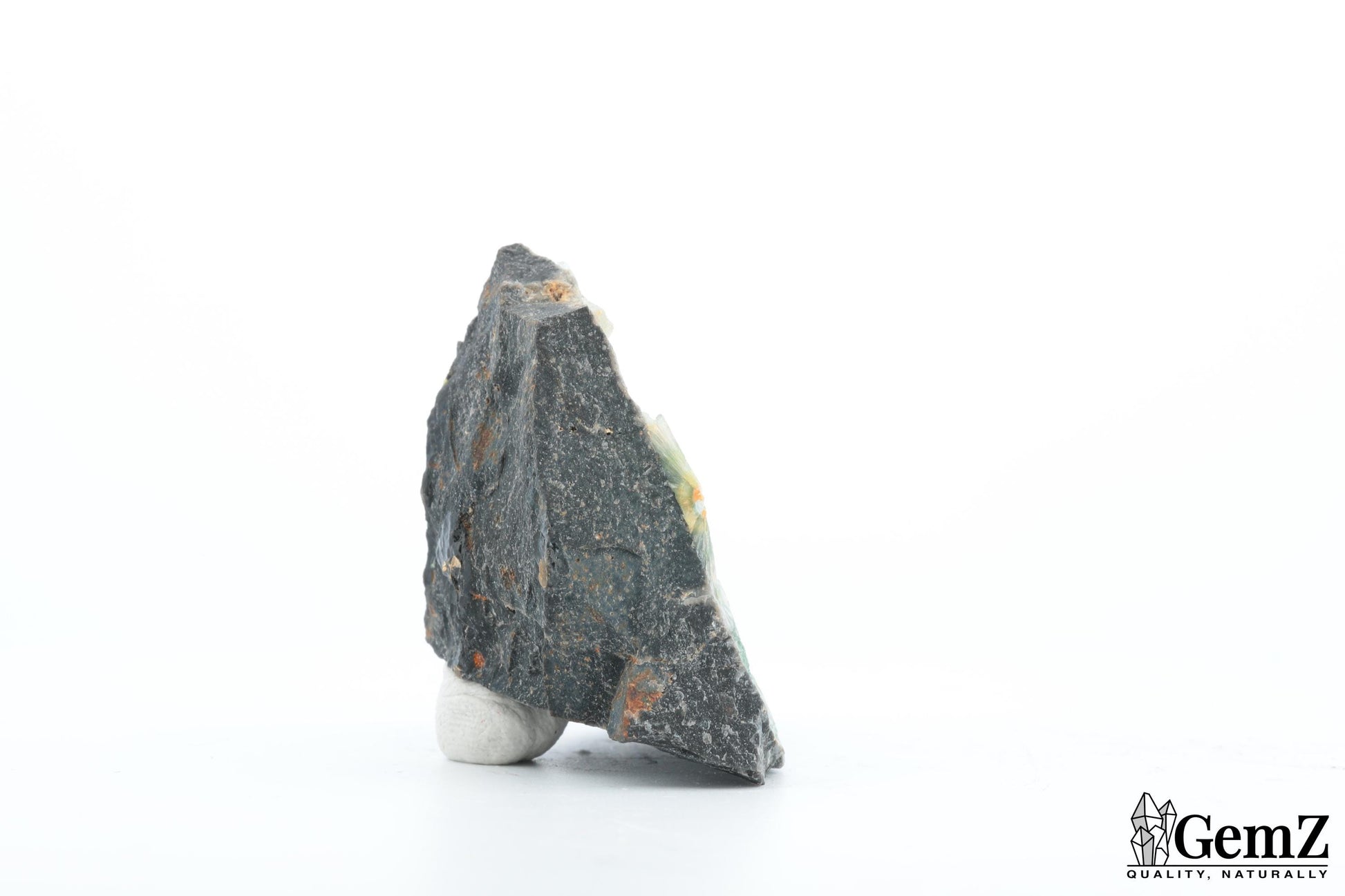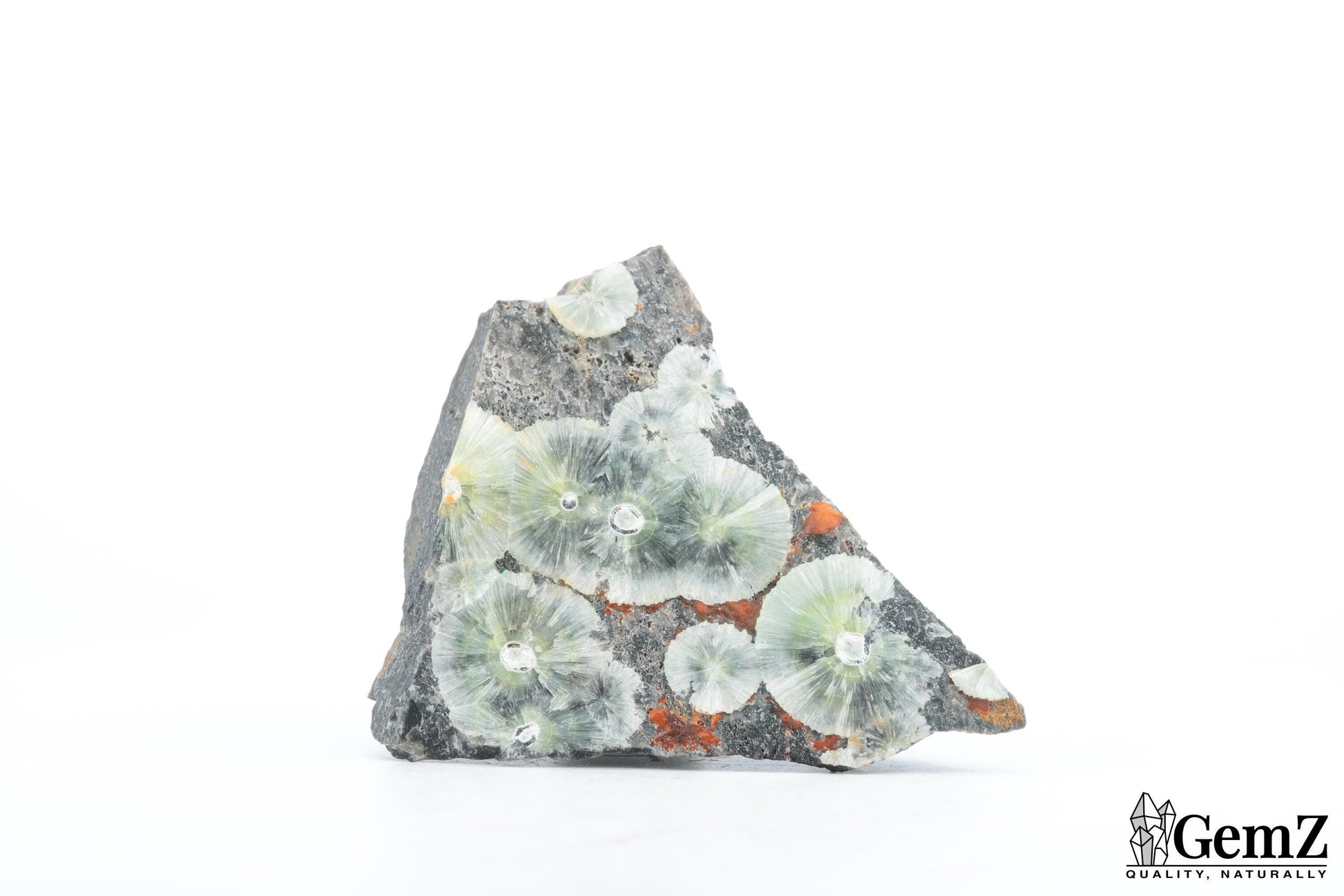 Composition : Cette pièce met en valeur de superbes formations de wavellite verte en rosettes radiales parfaitement cristallisées, contrastant avec une matrice rocheuse grise et des touches d’oxyde orange naturel. Les cristaux de wavellite sont disposés en cercles éclatants, leurs fibres cristallines délicates créant une texture soyeuse et lumineuse. Le subtil mélange de teintes vert pâle et de blanc donne à cet échantillon une esthétique fascinante et naturelle. Une rareté géologique idéale pour enrichir toute collection ou pour les amateurs de minéraux rares.